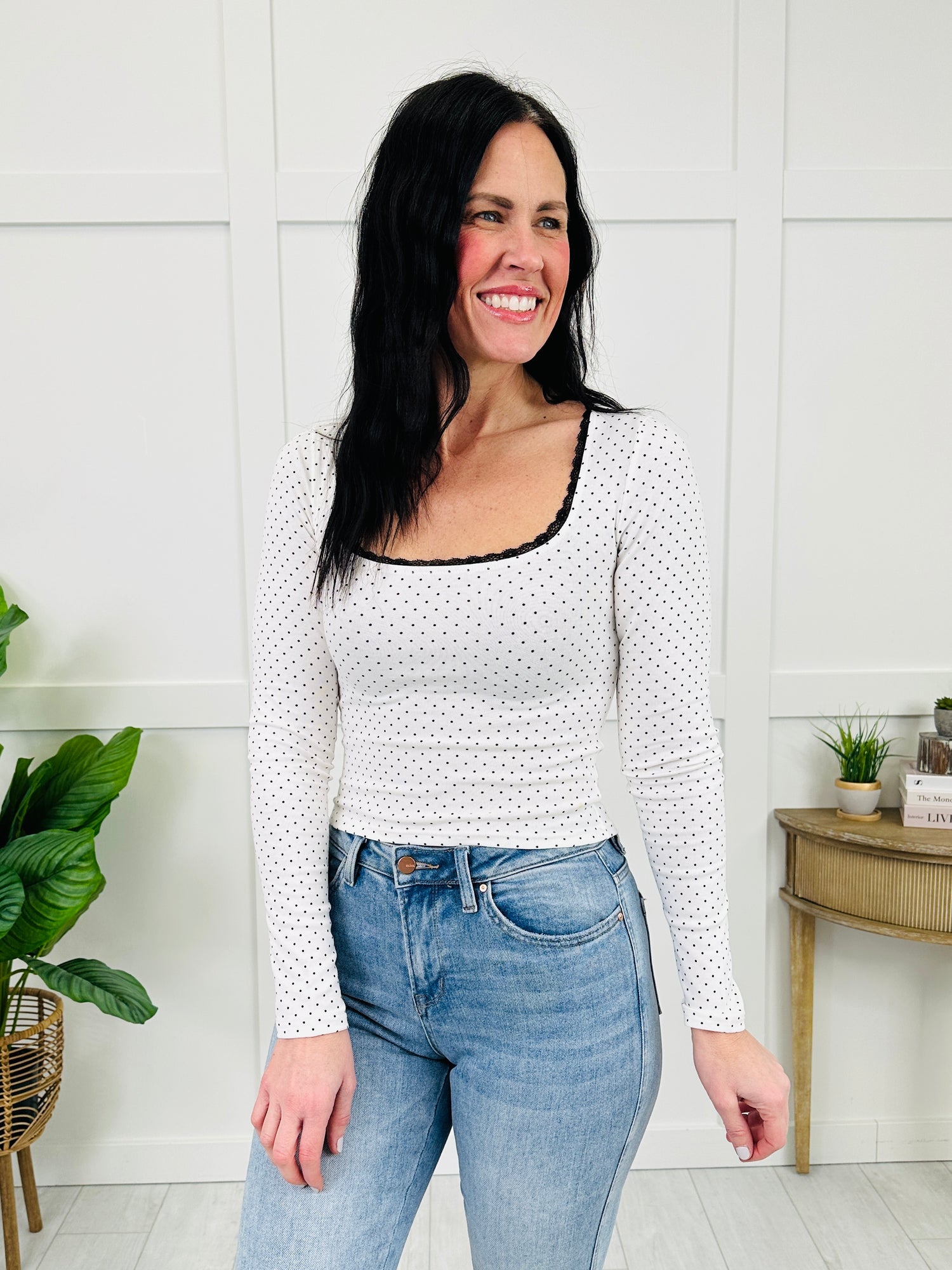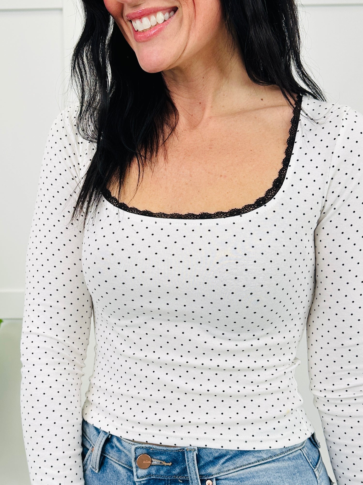 This polka dot top brings a fresh twist to a classic favorite. The square neckline and lace trim add a subtle, chic touch, making it the perfect blend of playful and polished. The long sleeves offer warmth without sacrificing style, while the allover polka dot print keeps things fun and flirty. Whether paired with jeans, skirts, or shorts, this top’s easy-to-wear design and charming details make it a wardrobe essential.