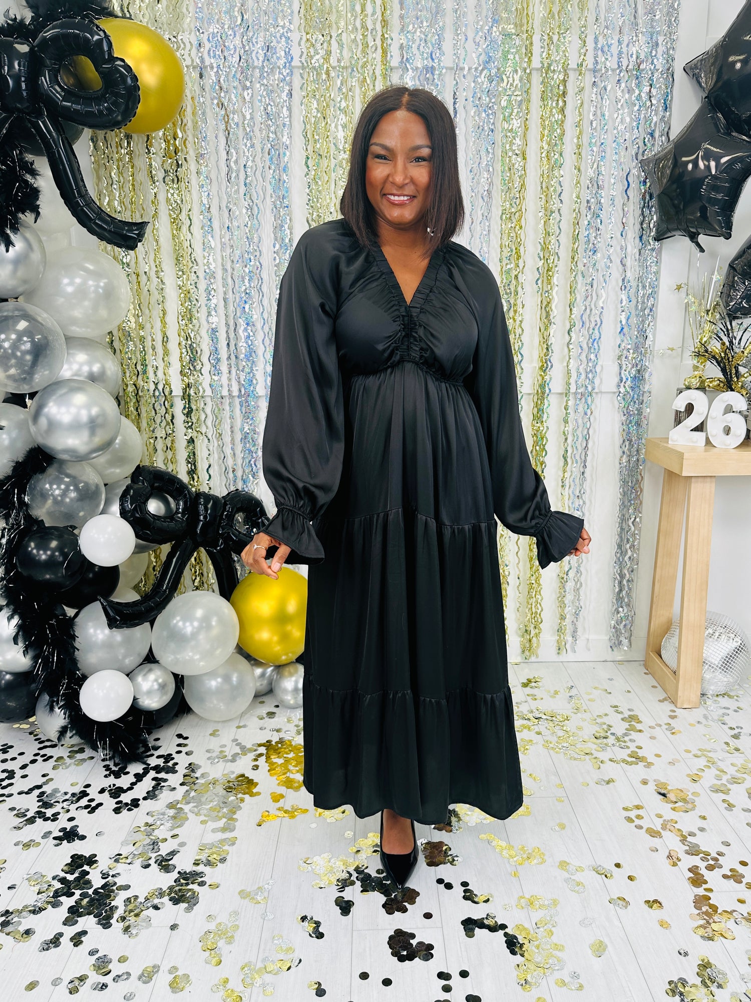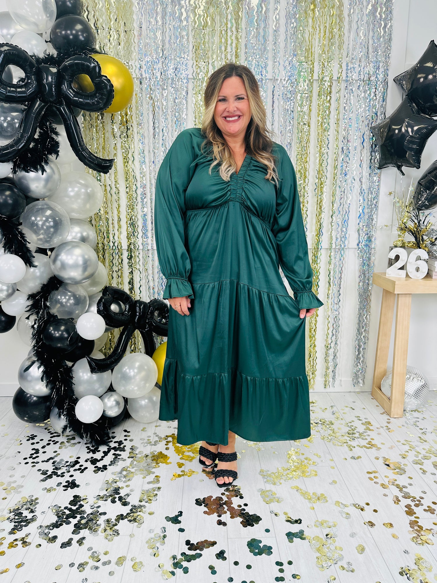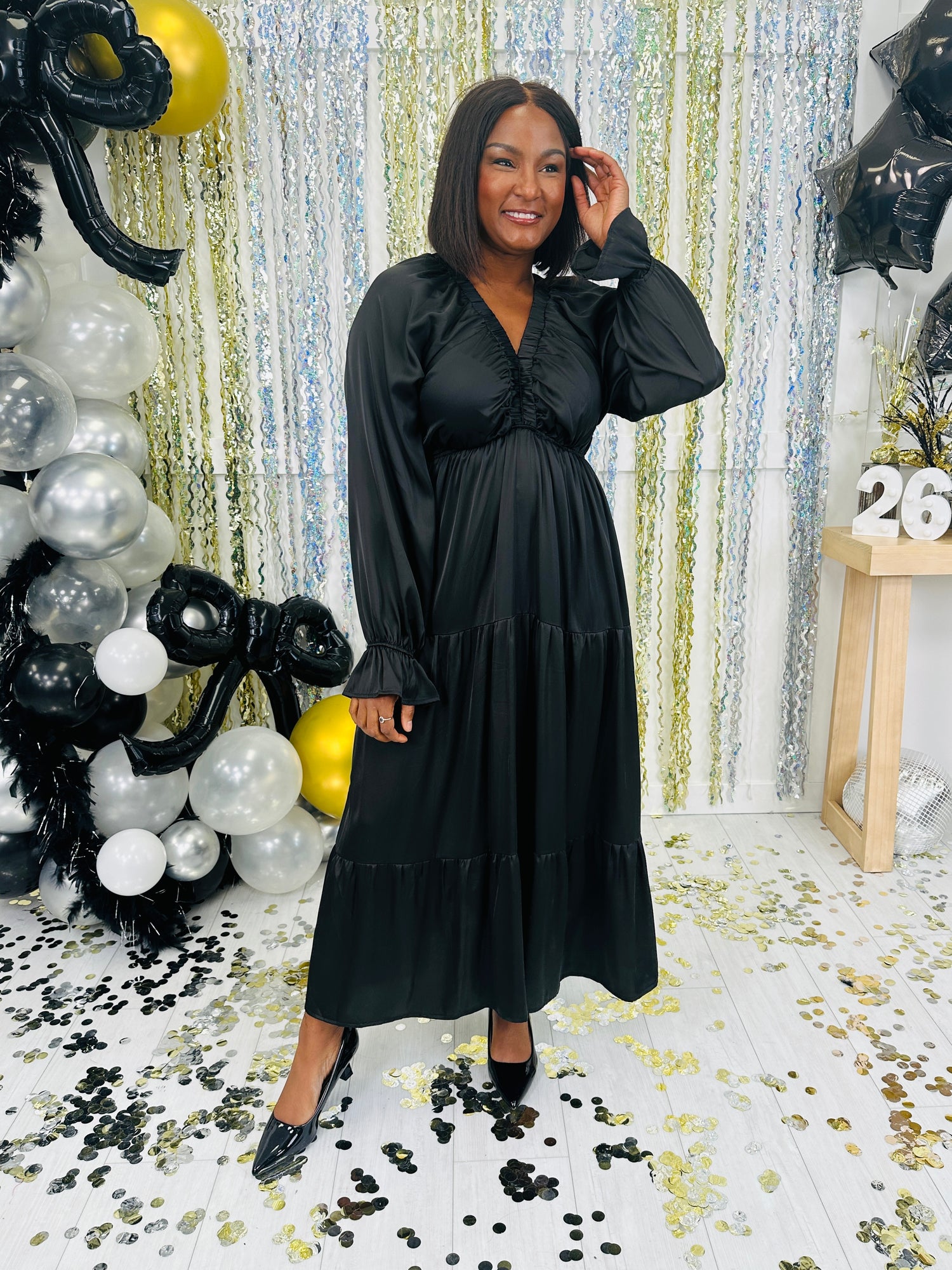 This dress offers a satin-like finish in a soft and flowy fabric, providing an elegant yet lightweight feel. The V-neckline with ruffle detailing adds a feminine touch, while the tiered skirt creates a flattering, flowy silhouette. Available in black and green, this dress is perfect for special occasions, combining style and comfort effortlessly.