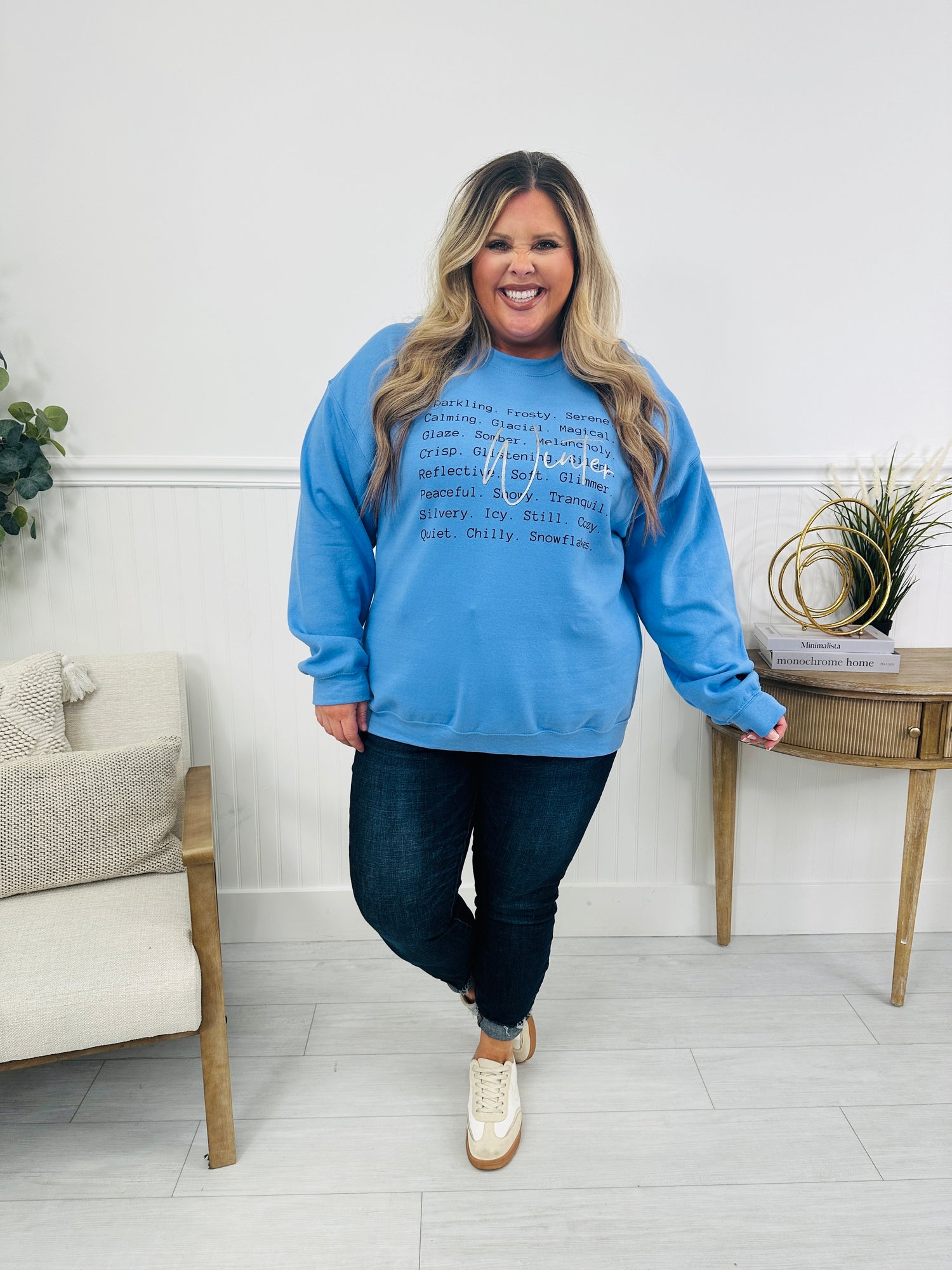 This sweatshirt is screen printed in-house on a soft, light blue sweatshirt for a bright, wintry feel. With its relaxed fit, it’s perfect for layering over your favorite cold-weather outfits or for cozying up indoors. Whether you're out in the snow or enjoying a cup of cocoa, this piece is sure to keep you warm while capturing the magic of winter.