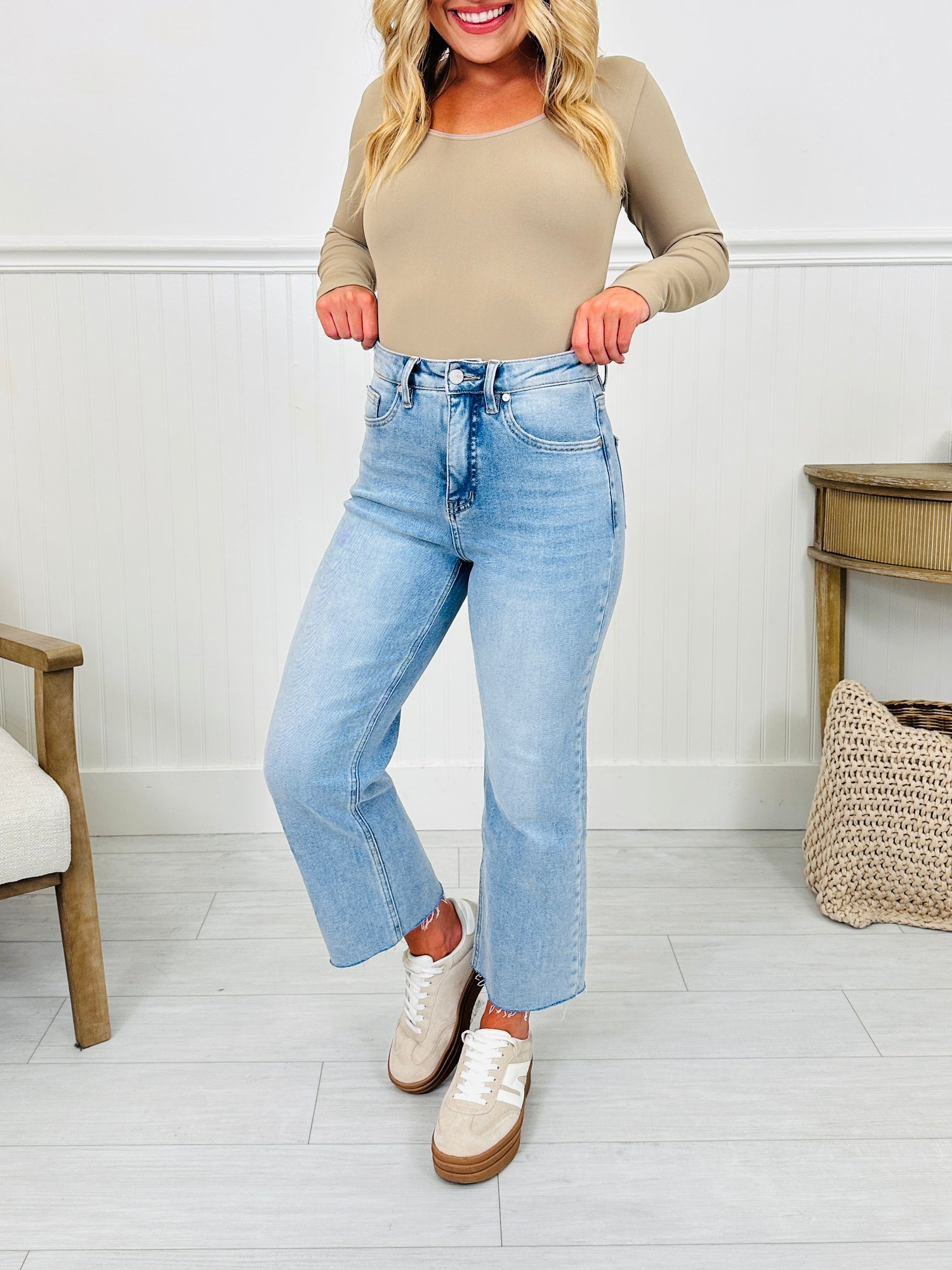 We are obsessing over wide leg crops this fall and these are the most versatile pair, yet! They are the perfect sneaker jean but also look adorable with your favorite fall booties! These jeans feature our viral tummy control panel that sucks you in and slims you out in all the right places for a confidence boost you didn't know could exist. They are so stretchy and hold their shape all day long-- you do not have to worry about these sagging. They are buttery soft, too!