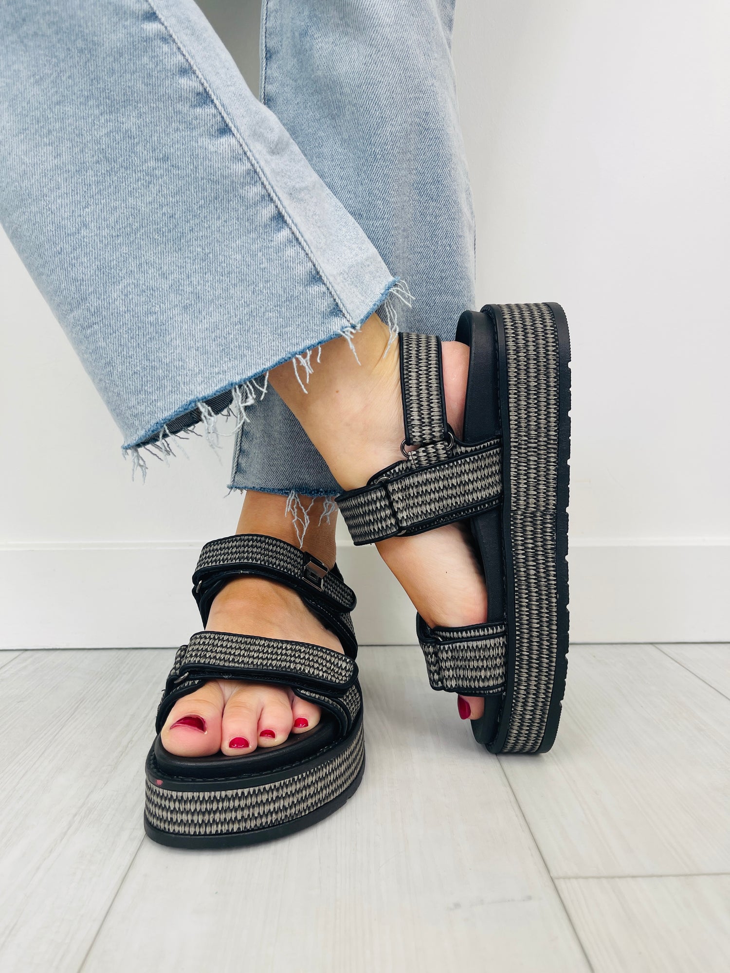These sandals combine sporty comfort with a bold, modern look. The dual adjustable straps provide a customizable fit, while the secure back strap helps keep your foot comfortably in place throughout the day. A textured platform sole adds visual interest and subtle height without sacrificing stability. Finished with a cushioned footbed for added comfort, these sandals are an easy choice for everyday wear, pairing perfectly with denim, dresses, or casual sets.