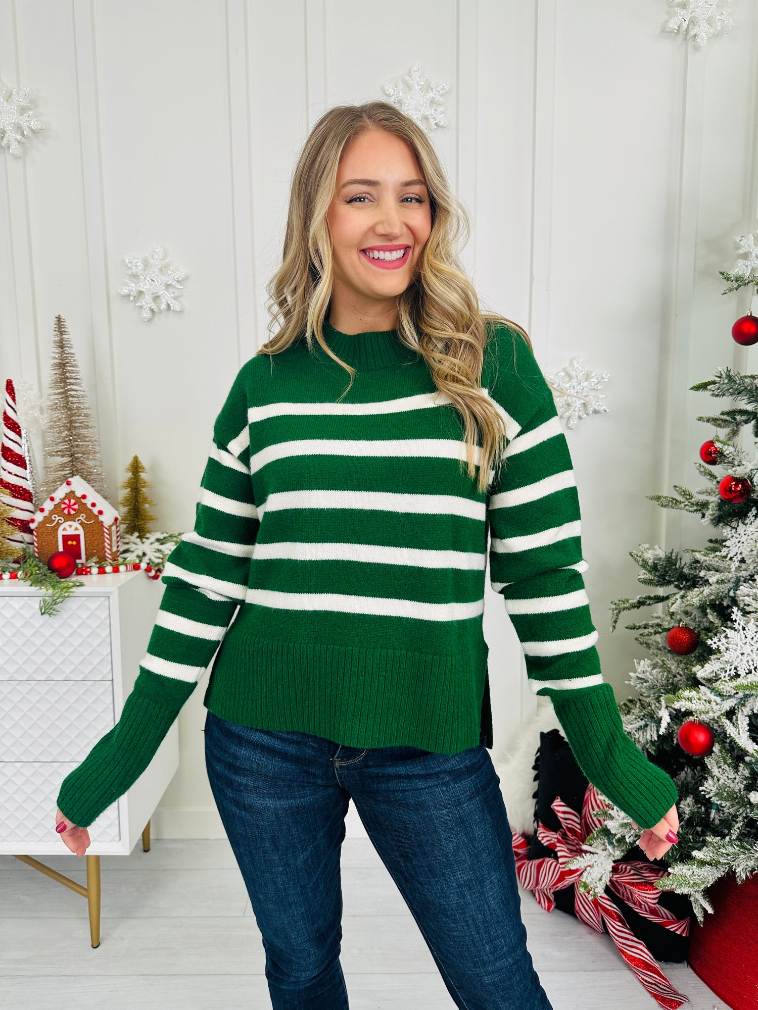 Wrap yourself in classic charm with this cozy, striped sweater! With its relaxed fit, side slits, and thick textured trim, this sweater pairs effortlessly with your favorite jeans for an easygoing, stylish look. Perfectly versatile, it’s a timeless piece that will keep you looking chic and comfortable all season long.