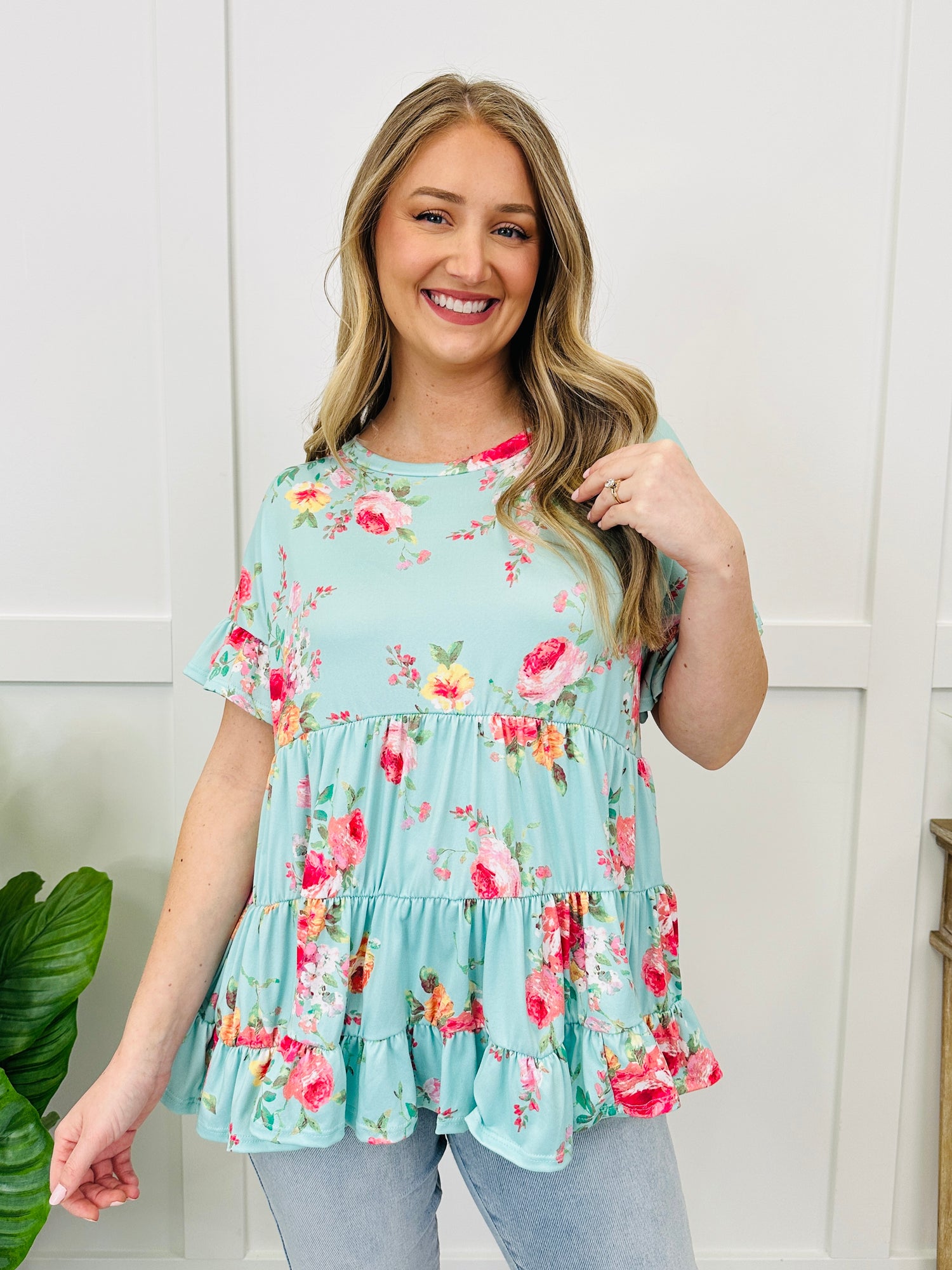 This top brings an effortlessly sweet and feminine feel to your everyday style. The soft floral print adds a fresh, cheerful look, while the ruffled sleeve detail gives it just the right touch of playful charm. A tiered silhouette creates beautiful movement and a flattering drape, and the relaxed flowy fit keeps it comfortable for all-day wear. Pair it with your favorite denim or shorts for an easy outfit that feels light, pretty, and perfectly put together.