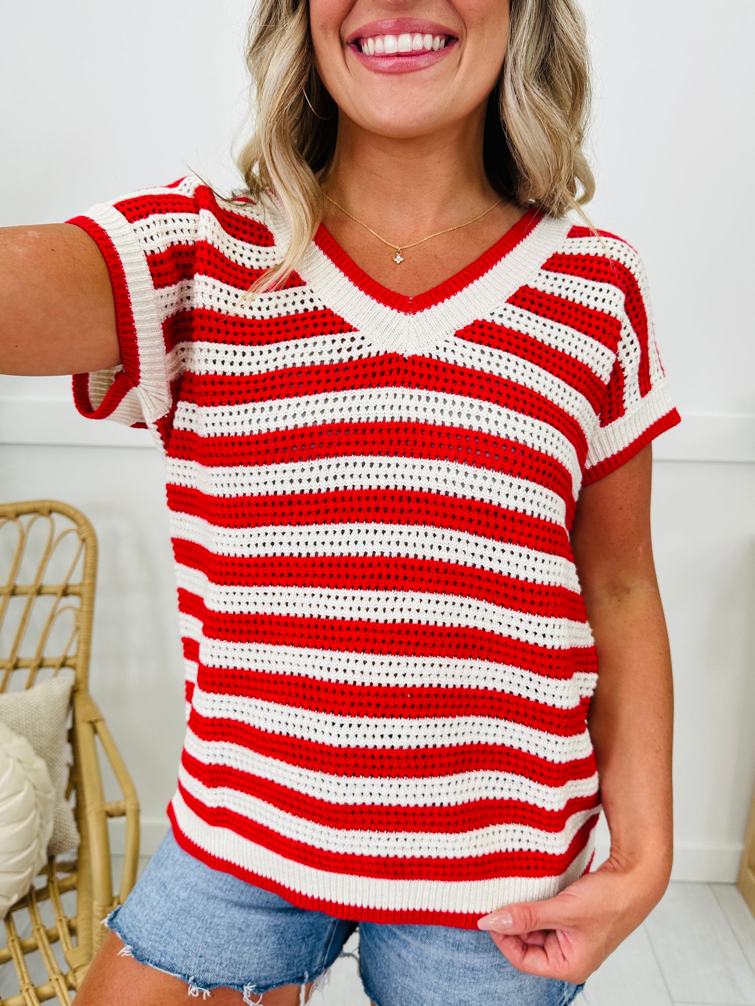 This new arrival is PERFECT for the Fourth of July and to wear all summer long. We love the high quality knit that is breathable and perfect for summer weather. The v-neck line is feminine and trendy. The fit is slightly oversized and flattering on all body types. Stripes are trending this summer and you are going to look so festive for the Fourth of July in this new top!