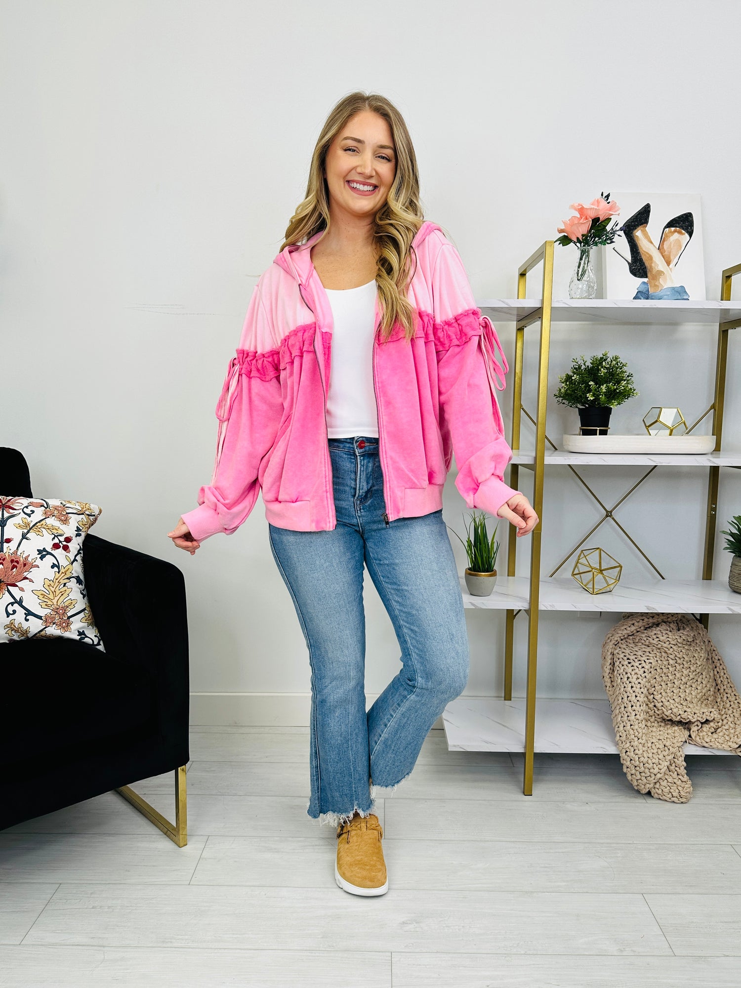 This zip-up hoodie brings the drama in the cutest way with bold pink colorblocked panels, a comfy relaxed fit, and playful tie accents on the sleeves. Finished with a cozy hood, functional front pockets, and banded cuffs and hem, it’s the throw-on-and-go layer that instantly makes your outfit feel more fun.