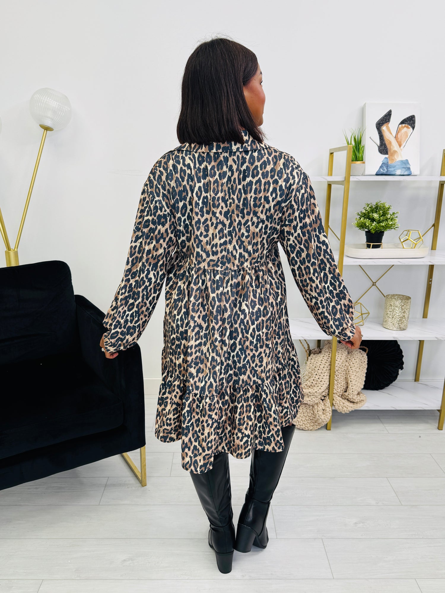 Bold and playful, this leopard dress pairs a classic collared split neckline with a breezy, tiered silhouette. The relaxed, flowy fit skims the body for easy movement and an effortless feel. Finished with long sleeves and an above-the-knee length, it’s made to style with boots or flats for instant outfit energy.