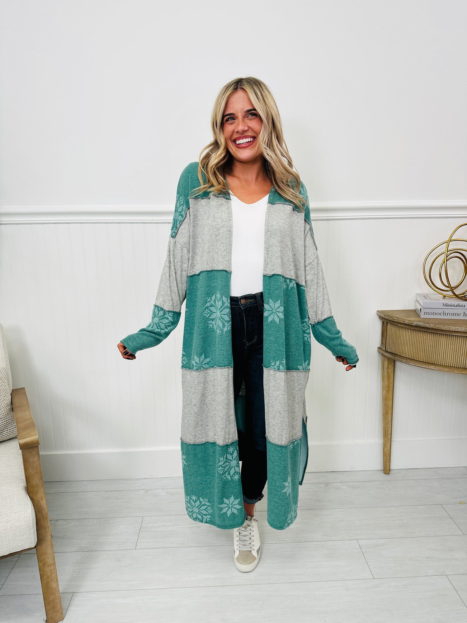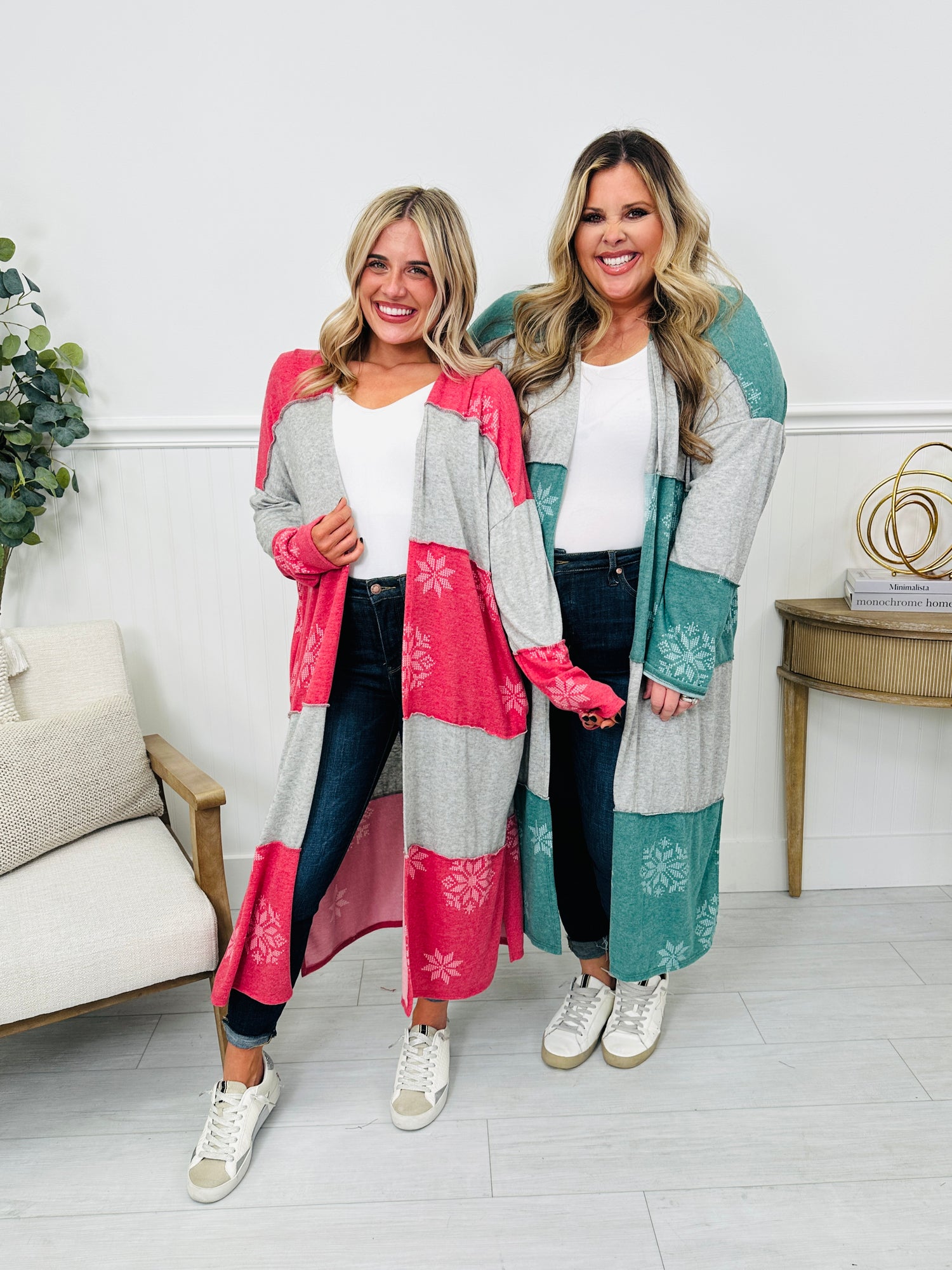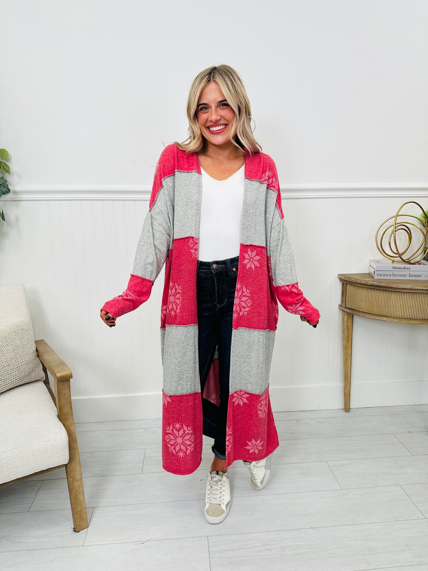 Add a festive touch to your winter wardrobe with this vibrant color block cardigan. Featuring bold alternating panels accented by snowflake detailing, this piece brings cheerful charm to chilly days. The longline silhouette and relaxed fit make it perfect for layering over your favorite basics, adding both warmth and playful style all season long.