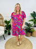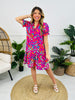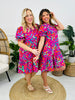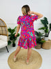Bright and playful, this dress is a statement piece with its eye-catching leaf print and vibrant color palette!
