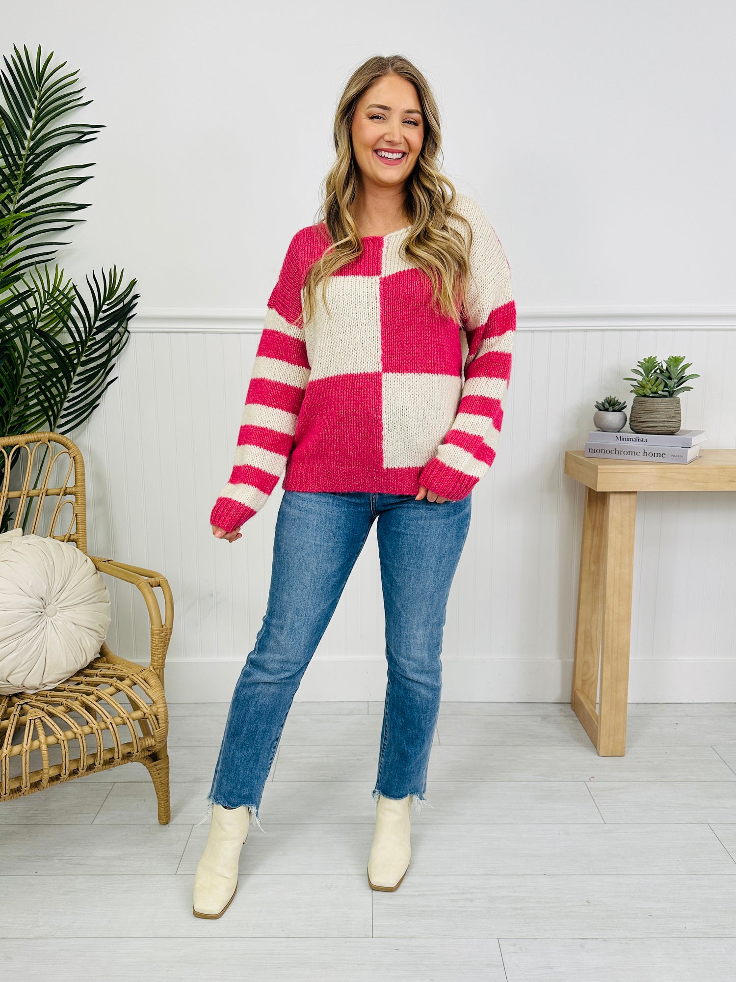 This sweater features a chunky checkered knit design that gives it a fun, eye-catching look while still feeling easy to wear. The striped sleeves add a playful contrast, and the banded trim at the neckline, cuffs, and hem create a clean, finished edge. It’s a cozy statement piece that pairs effortlessly with your favorite denim for an everyday look that still feels special.