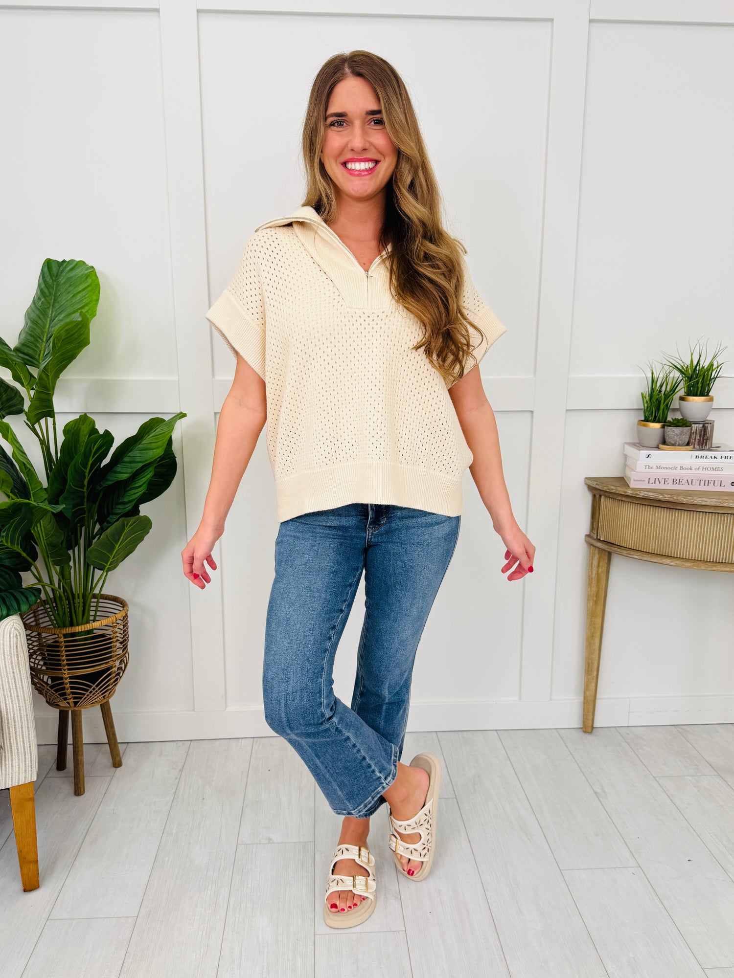 This airy knit top is the perfect mix of sporty and sweet, with its half-zip collar adding a clean, elevated touch. The perforated texture keeps it light and breathable, while the banded hem gives it a polished, easy shape that looks instantly put-together with your favorite denim.