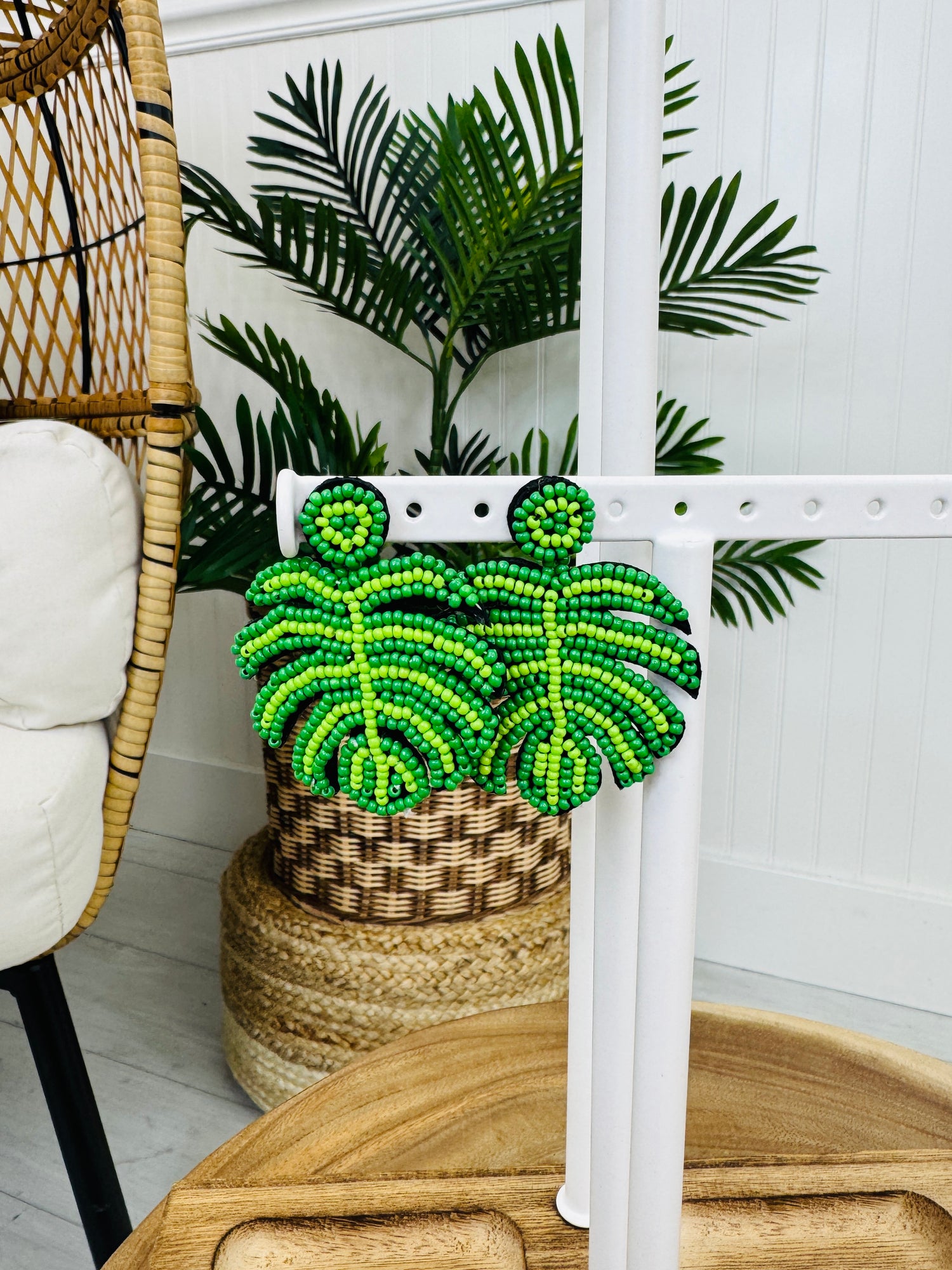 Make a bold statement with these tropical-inspired beaded earrings! Designed in the shape of lush monstera leaves, these beauties feature intricate hand-beaded detailing in vibrant shades of green. Lightweight and eye-catching, they add the perfect pop of fun to any outfit!