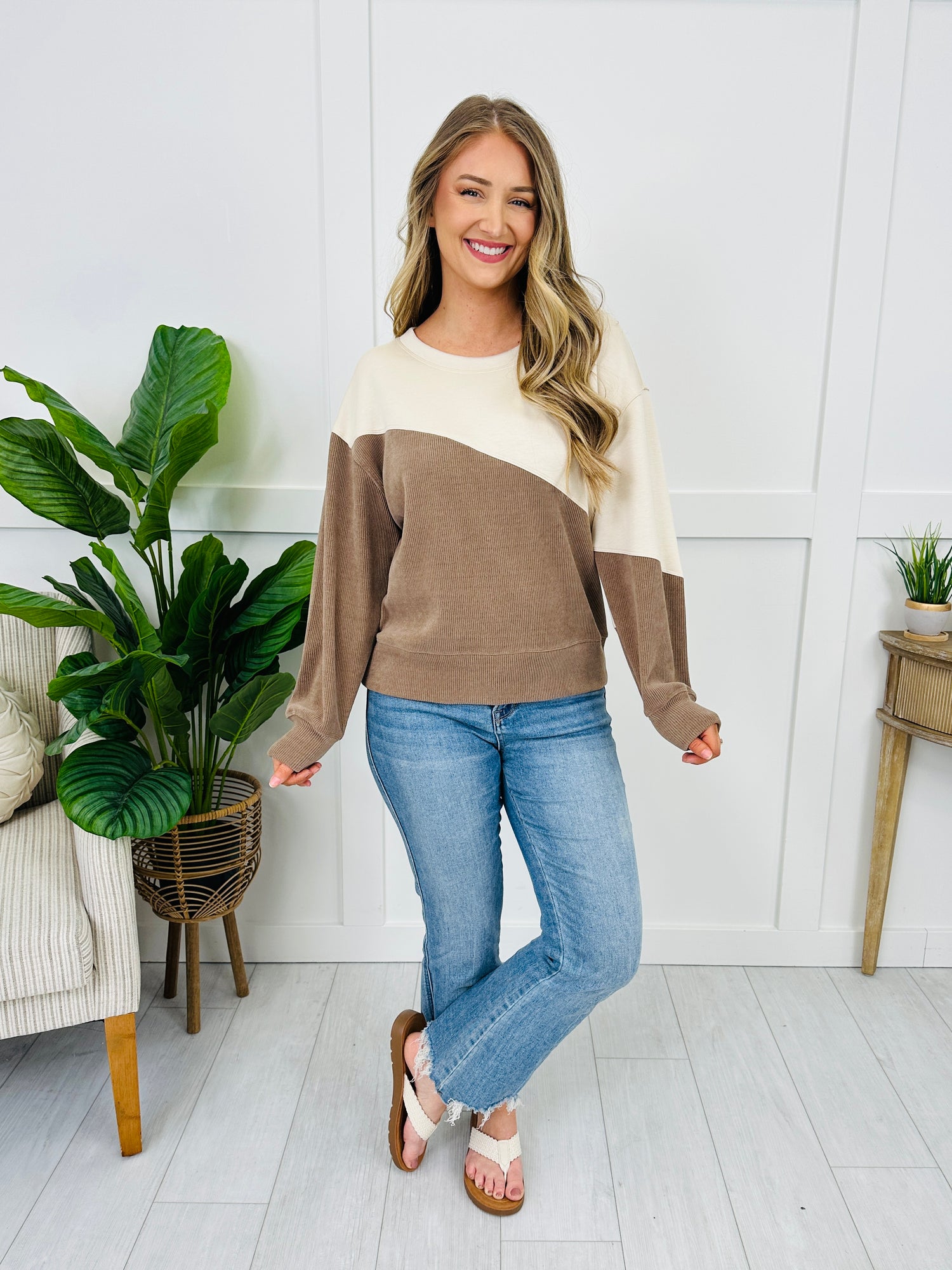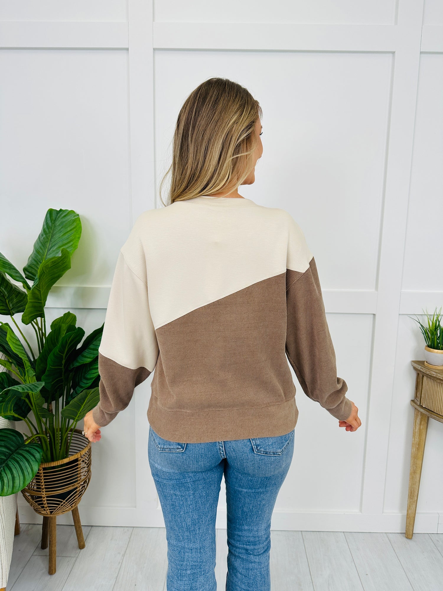 This top is all about that clean, elevated contrast — the diagonal colorblock detail gives it a modern twist while the raised, vertical texture adds extra dimension. Finished with a classic crew neckline and banded cuffs and hem, it has that easy, polished look you can throw on with denim and instantly feel put-together. Perfect for when you want comfy and cute in one simple piece.
