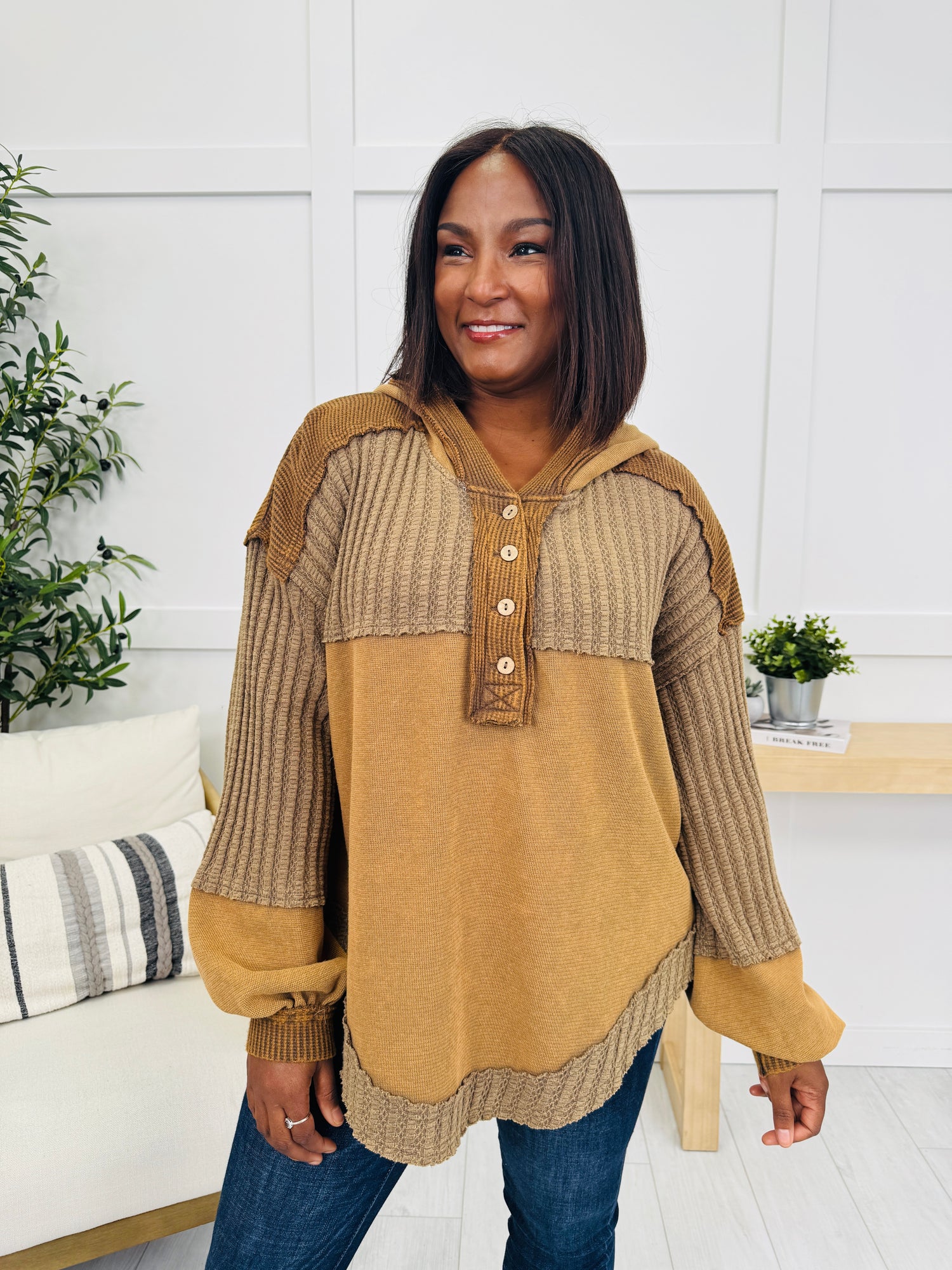 This cozy hooded top combines comfort and style with its rich, textured fabric and button-up detail. The mix of soft tones in the design makes it perfect for layering, while the hood and relaxed fit ensure maximum comfort. Featuring a unique, textured sleeve design, this piece will quickly become a go-to for casual, cozy days.
