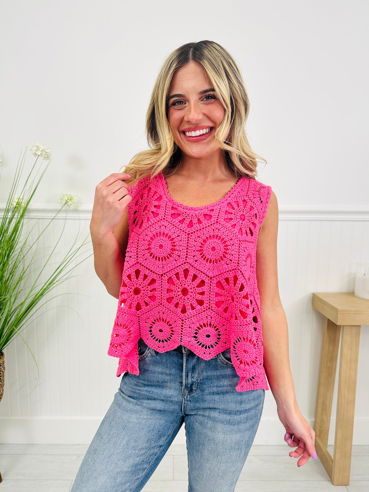 Crochet all day in this best selling top that is finally back in stock and just in time for summer! This crochet top is so trendy! It is breathable and perfect for warmer weather. It comes in one size only but is flowy and flattering and that one size fits sizes 0-14 (we've fit checked this and have sold thousands). We love the length because it's perfect to pair with both jeans and shorts. It is an easy top to wear for an effortless elevated look. This is our last restock of the season-- don't miss it!