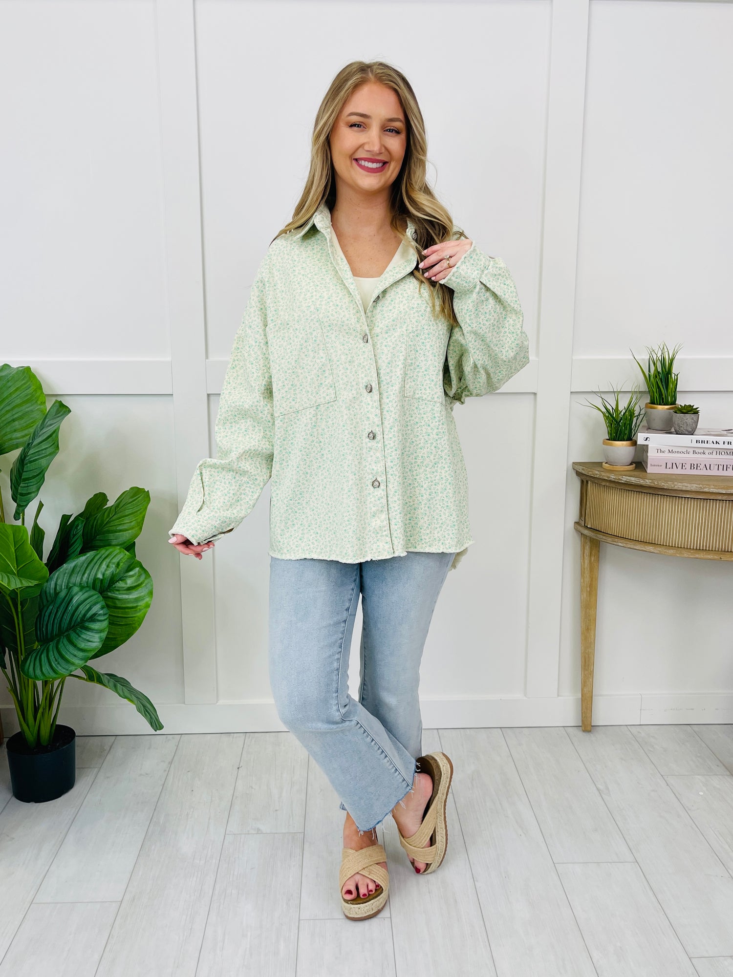 This top combines a classic silhouette with soft, feminine detail. The dainty floral print gives it a fresh, charming look, while the button front style keeps it timeless and easy to wear. A chest pocket detail adds a casual touch that balances the design, and the relaxed, easy fit makes it comfortable for layering or wearing on its own. It’s the perfect piece to pair with denim for an effortlessly styled outfit that feels laid-back and polished.