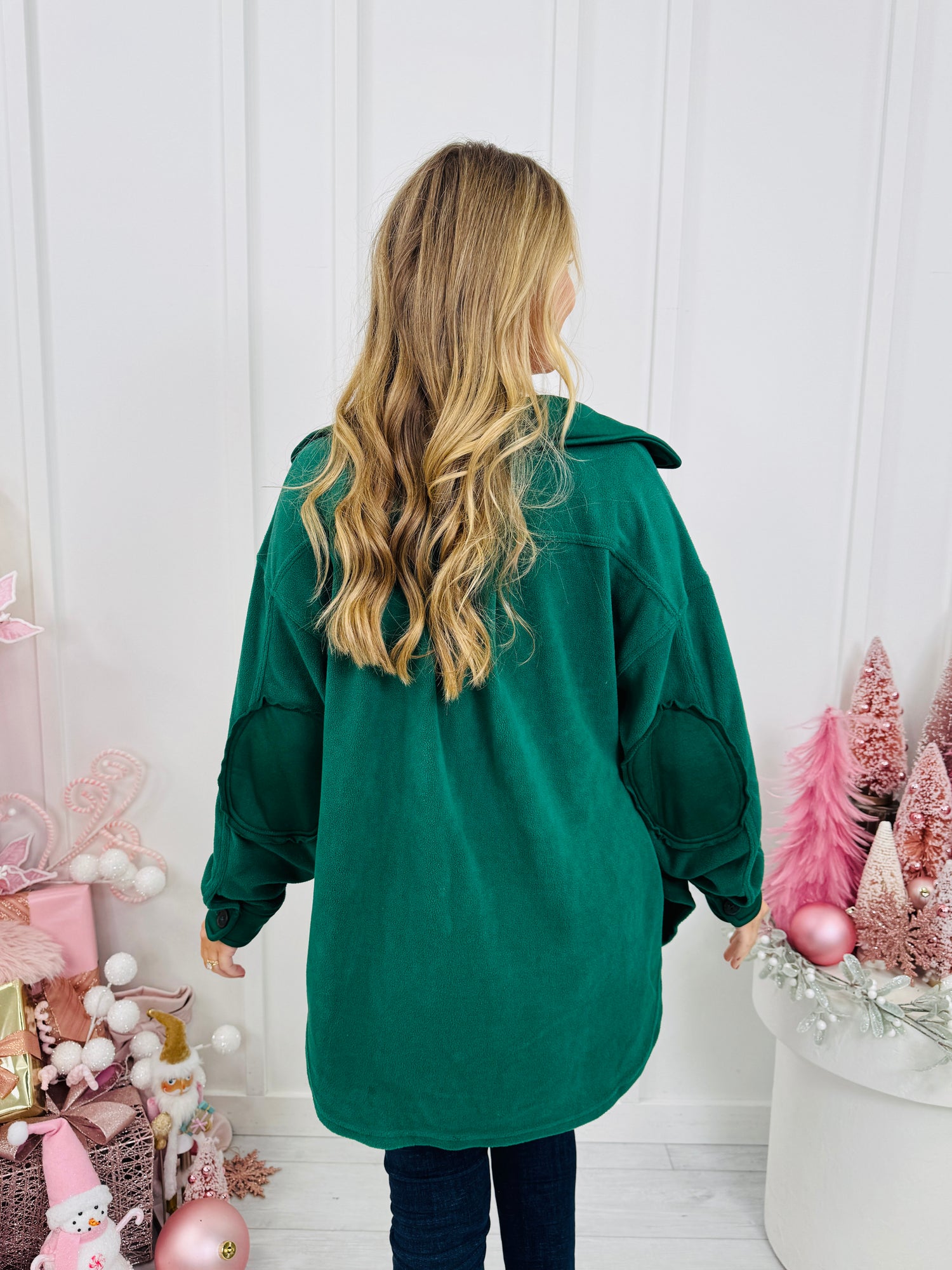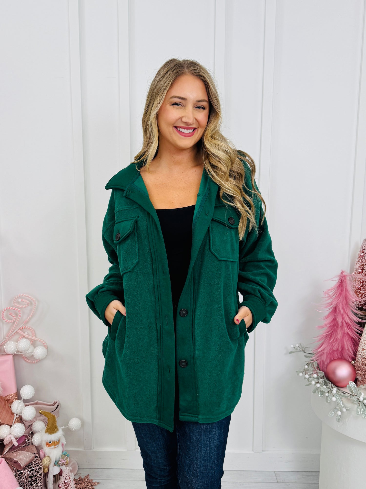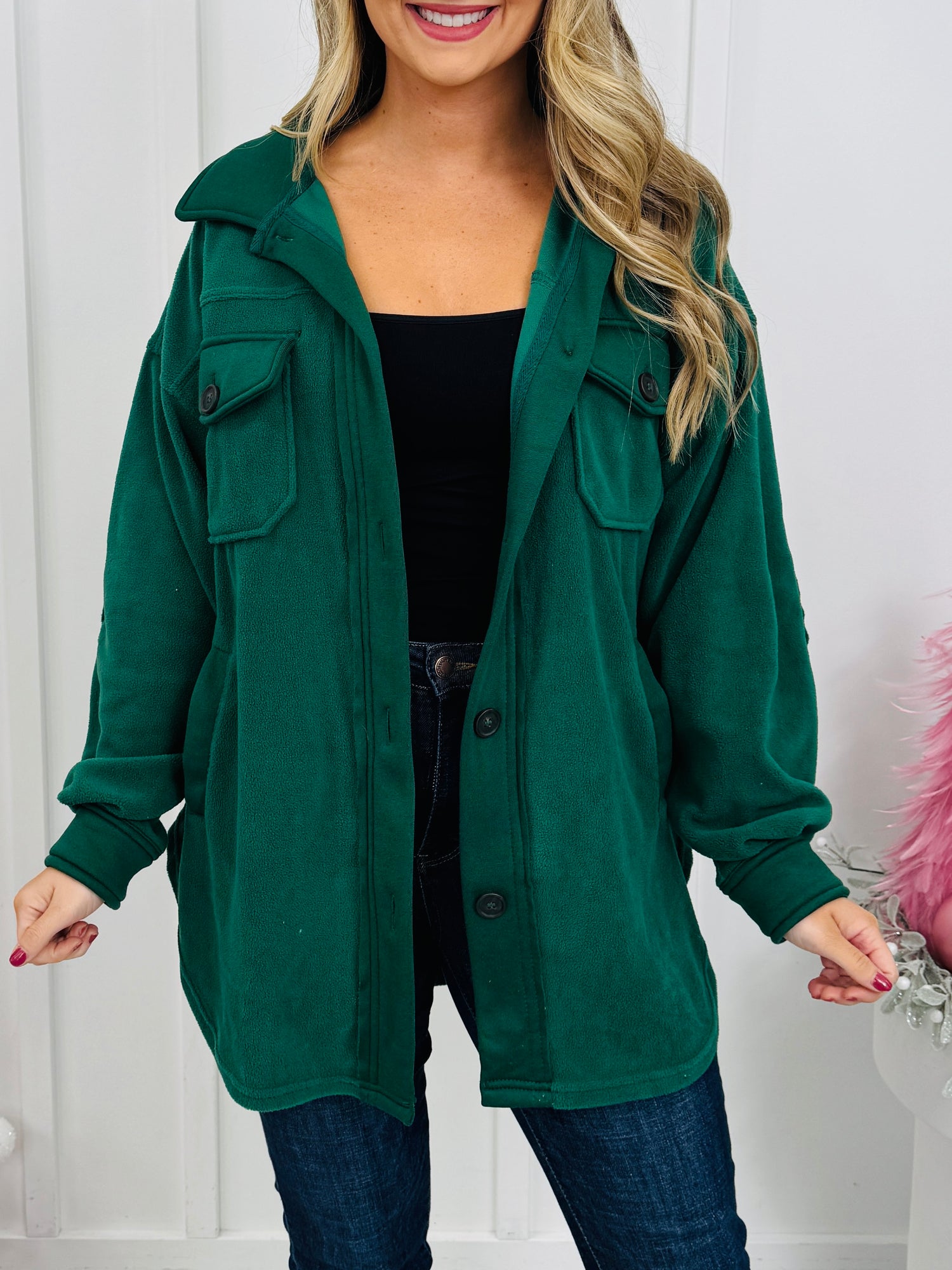 Crafted from a cozy fleece material, this shacket features a flattering curved hem for added comfort, two side pockets, and is the perfect layering piece for any look. With the colder months ahead, this casual shacket will have you looking and feeling your best. Pull it on over a graphic tee with leggings and sneakers for a cute and cozy 'fit, or change it up and wear it over a neutral top with skinny jeans and booties!