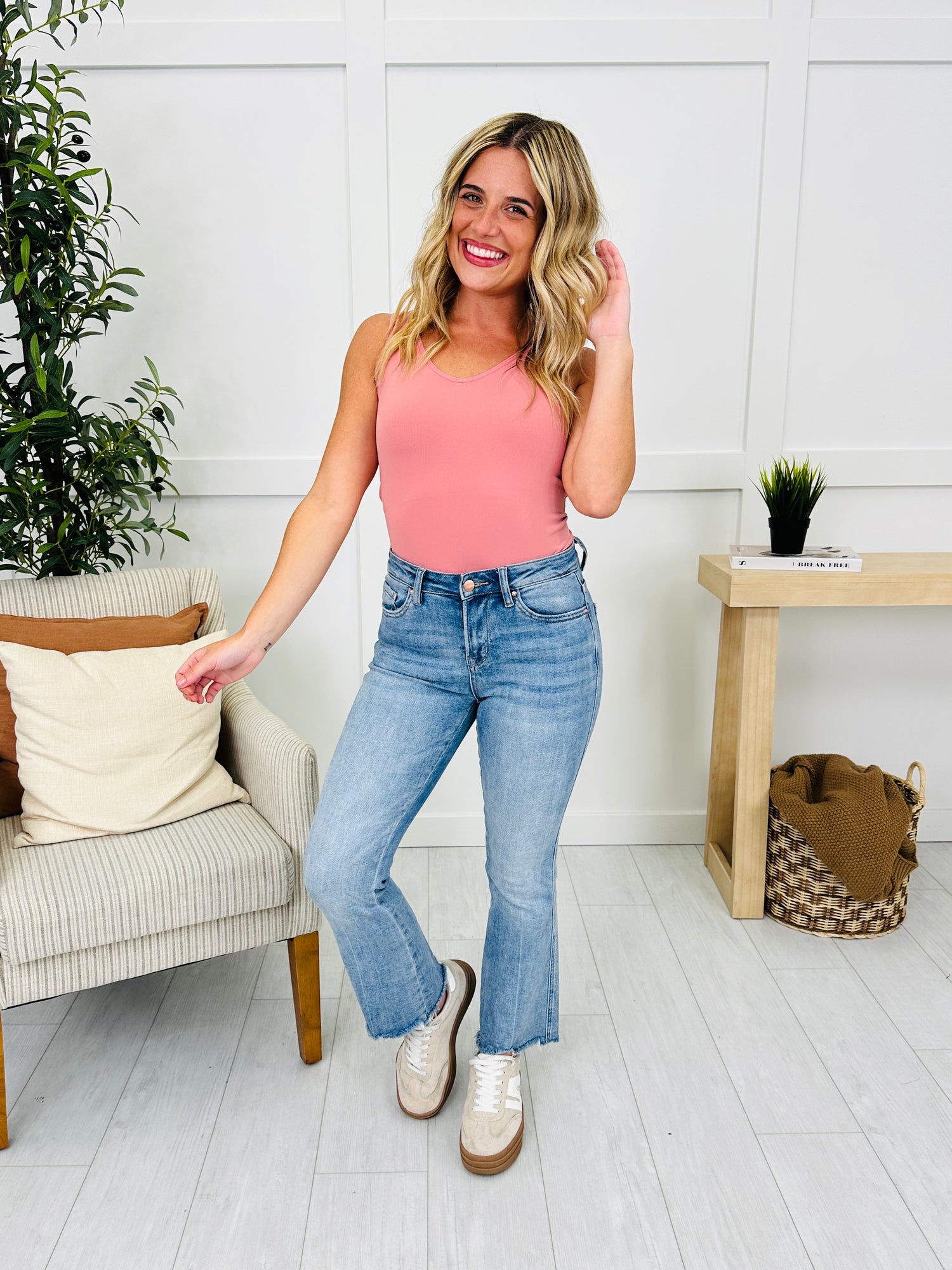 You will wear this tank every single day! They are the best tanks ever, and our customers agree! This tank has a scoop neck in the front and a v-neck in the back for a 2 in 1 look!