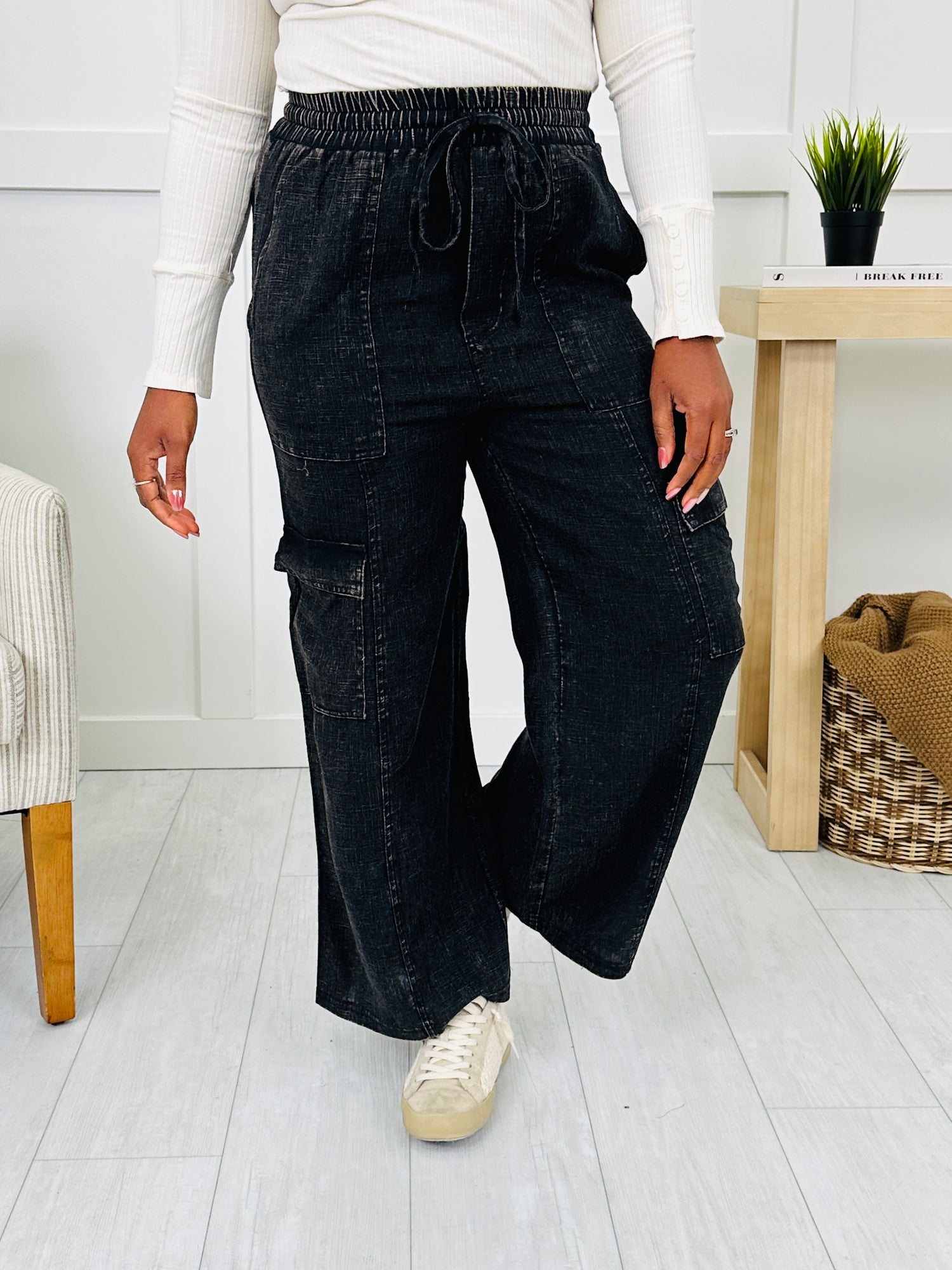 These bottoms bring together a laid-back fit with just the right amount of utility style. The relaxed wide leg gives them an easy, flowy drape, while the cargo pocket detail adds a touch of casual edge. Finished with a stretchy waistband fit and drawstring tie, they’re perfect for all-day comfort and effortless styling.