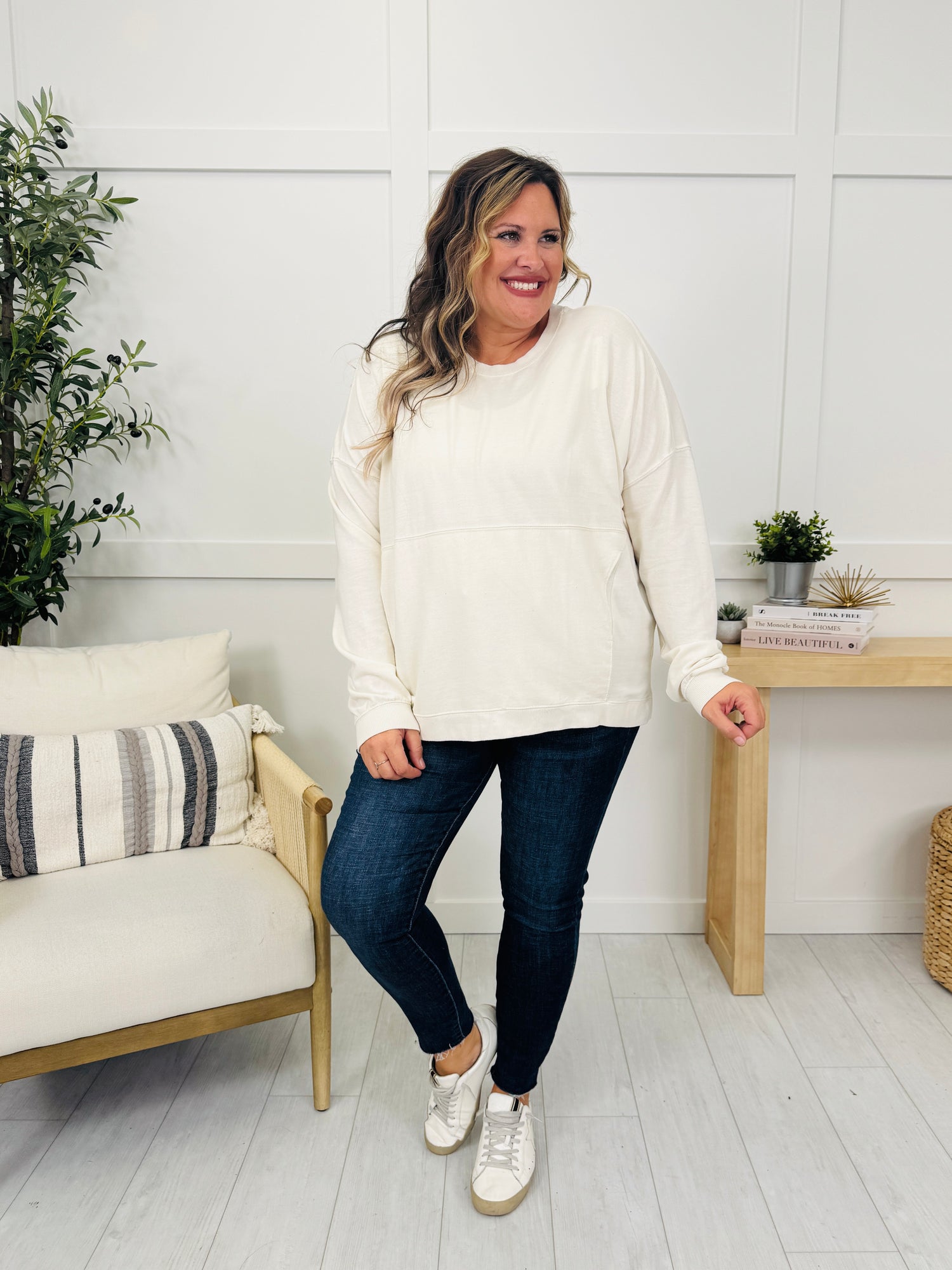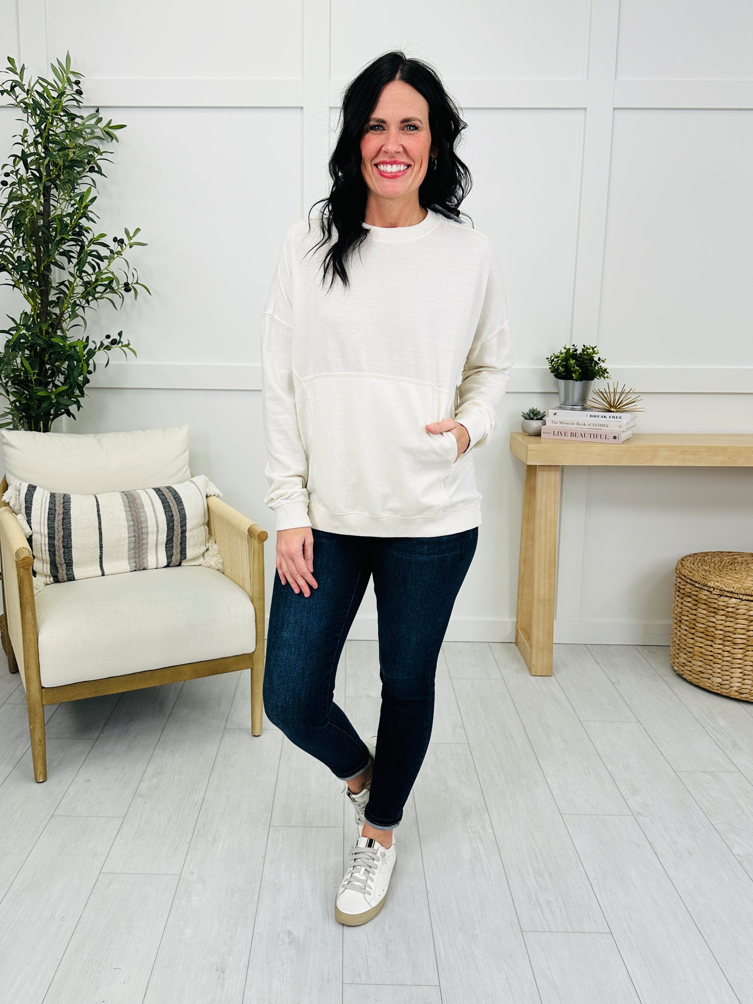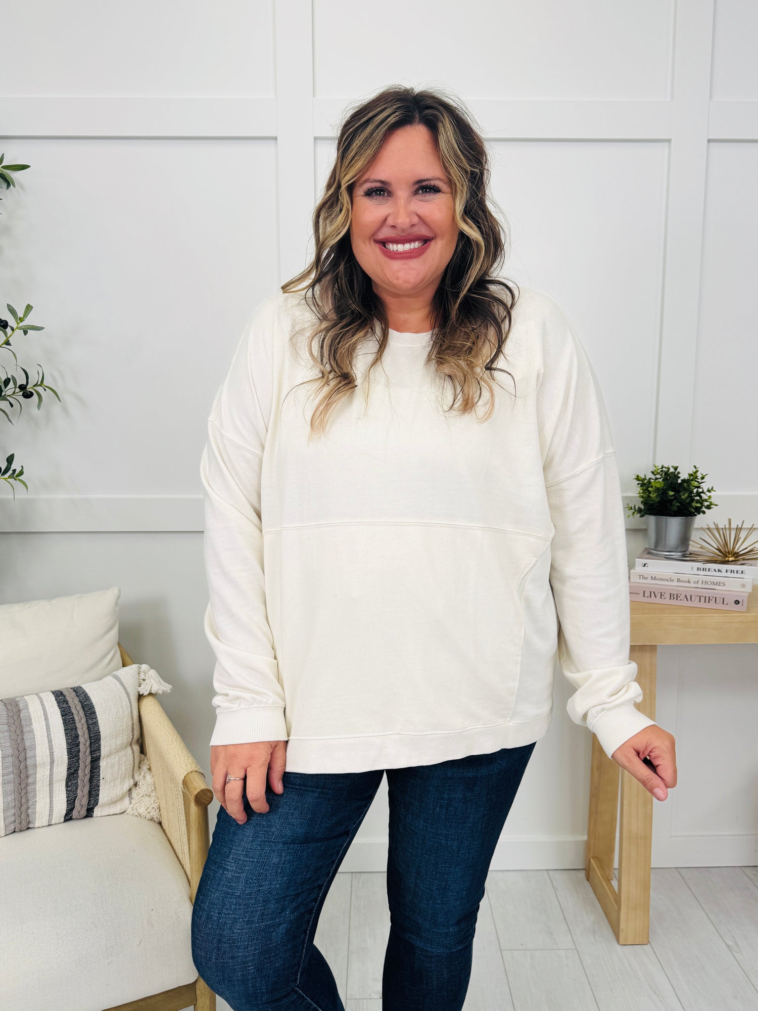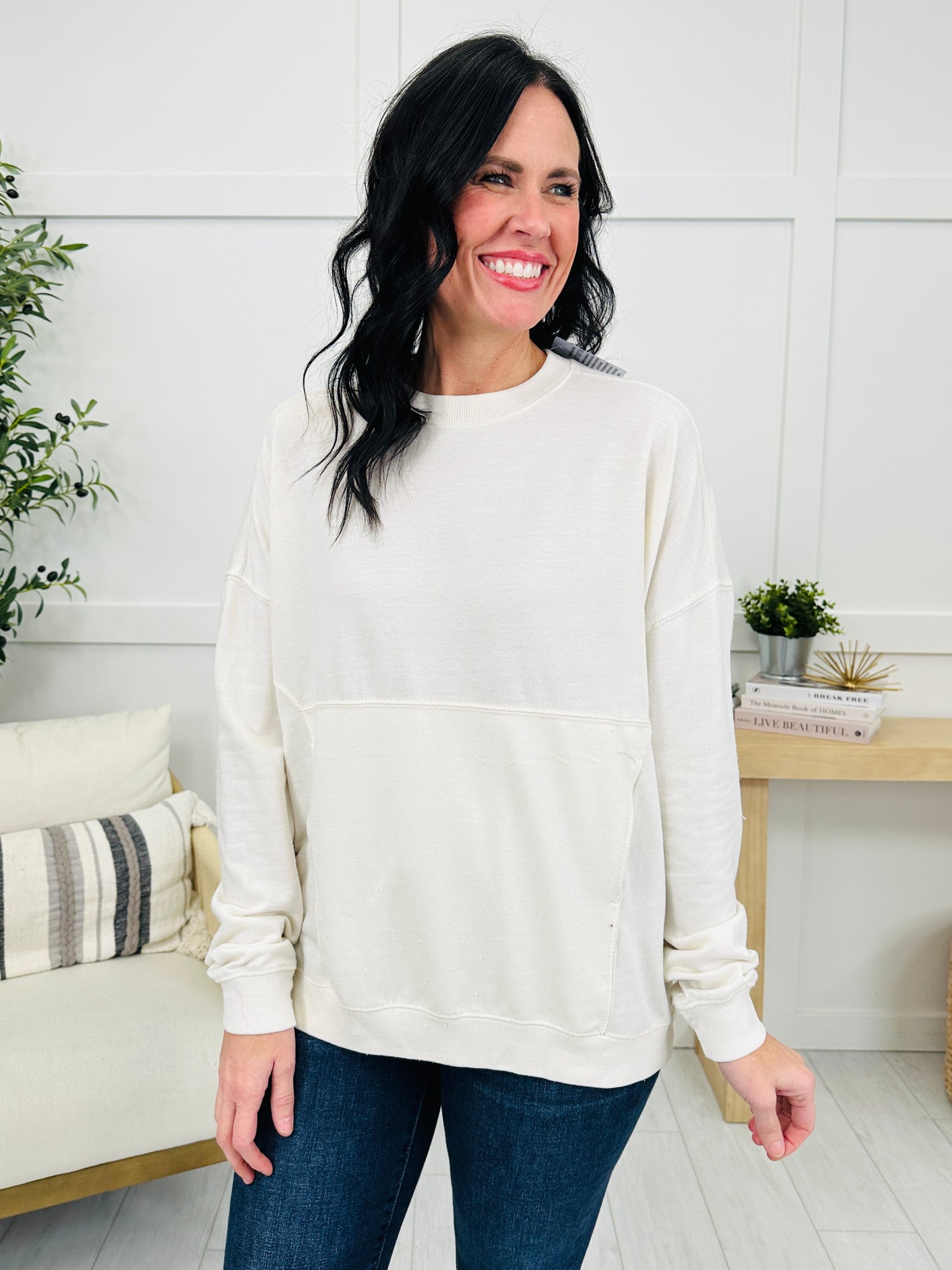 This cozy sweatshirt is made from soft fabric that feels comfortable and relaxed against the skin. With its relaxed fit and flattering seam details, this piece offers a casual, chic look perfect for layering or wearing on its own. Ideal for cozy days at home or casual outings, this sweatshirt combines comfort and style effortlessly.