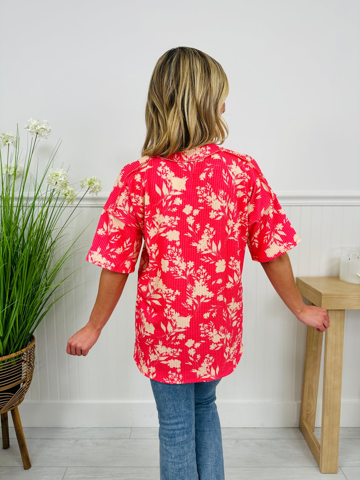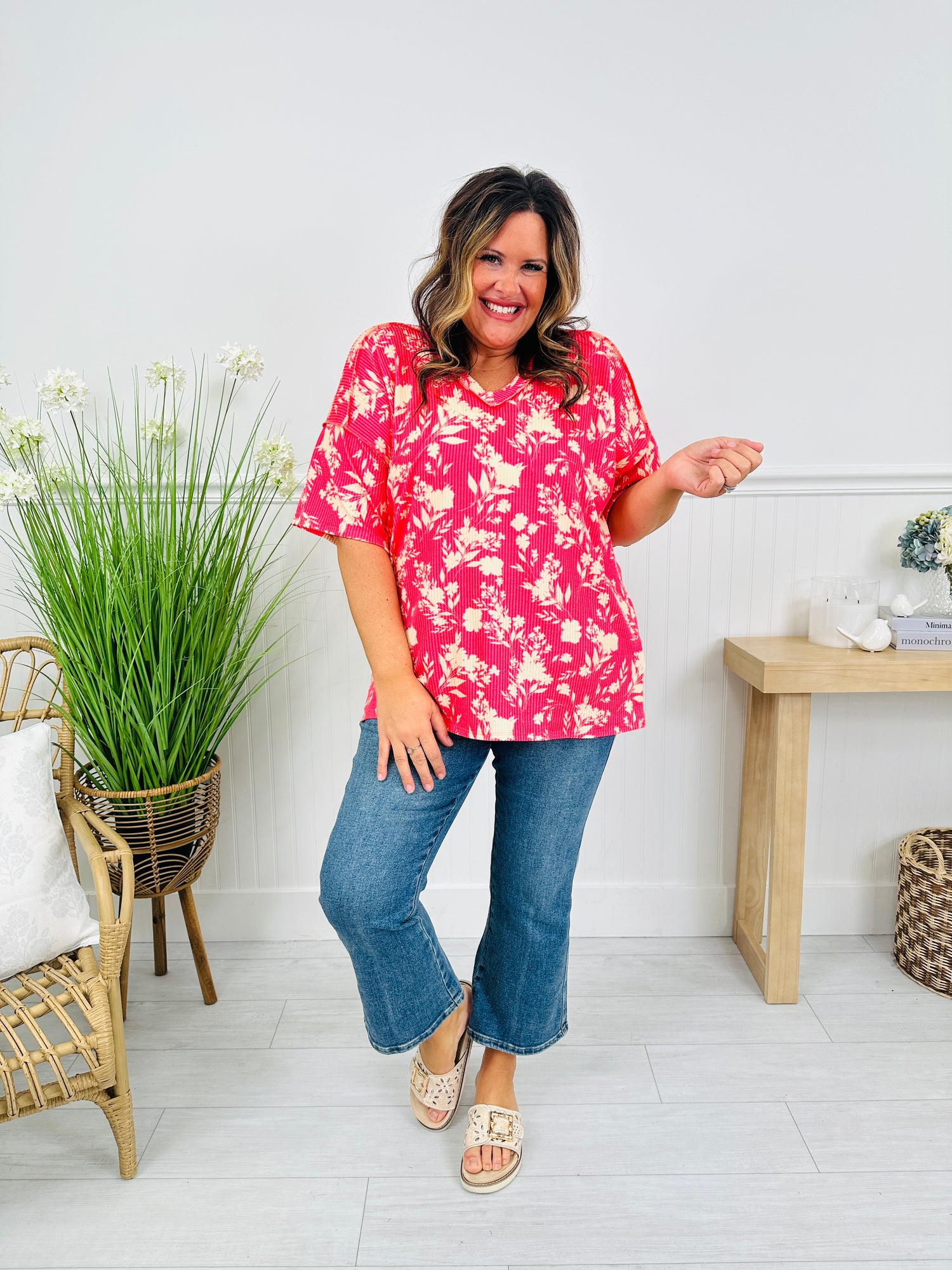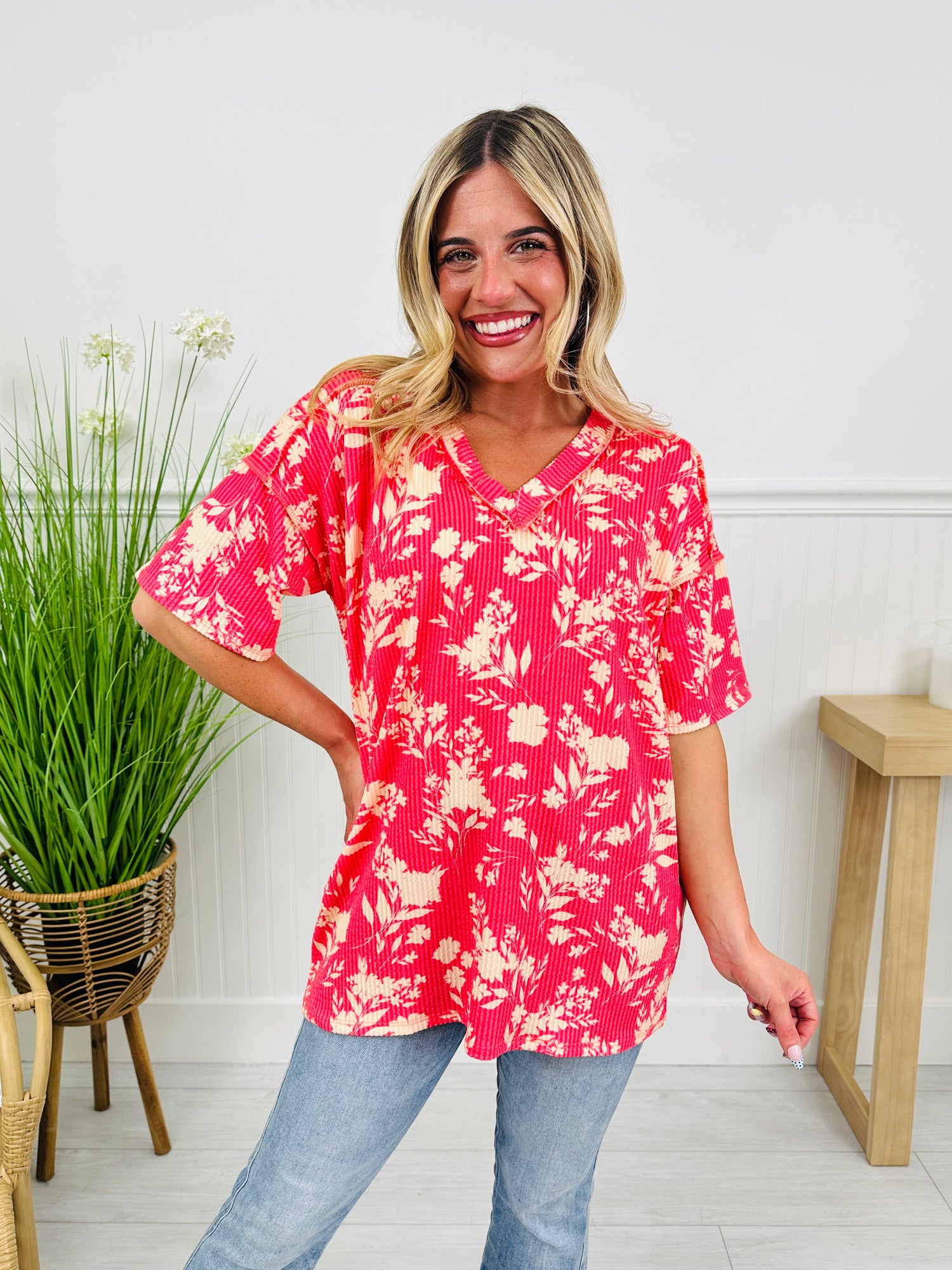 You'll be dreaming of sunshine as soon as you put this new top on. This top is made from our best selling raised rib material that our customers rave about. It usually is only made in solids but for the first time, we decided to create it in bright and bold prints that will instantly boost your mood and have you dreaming of the sunny days ahead.