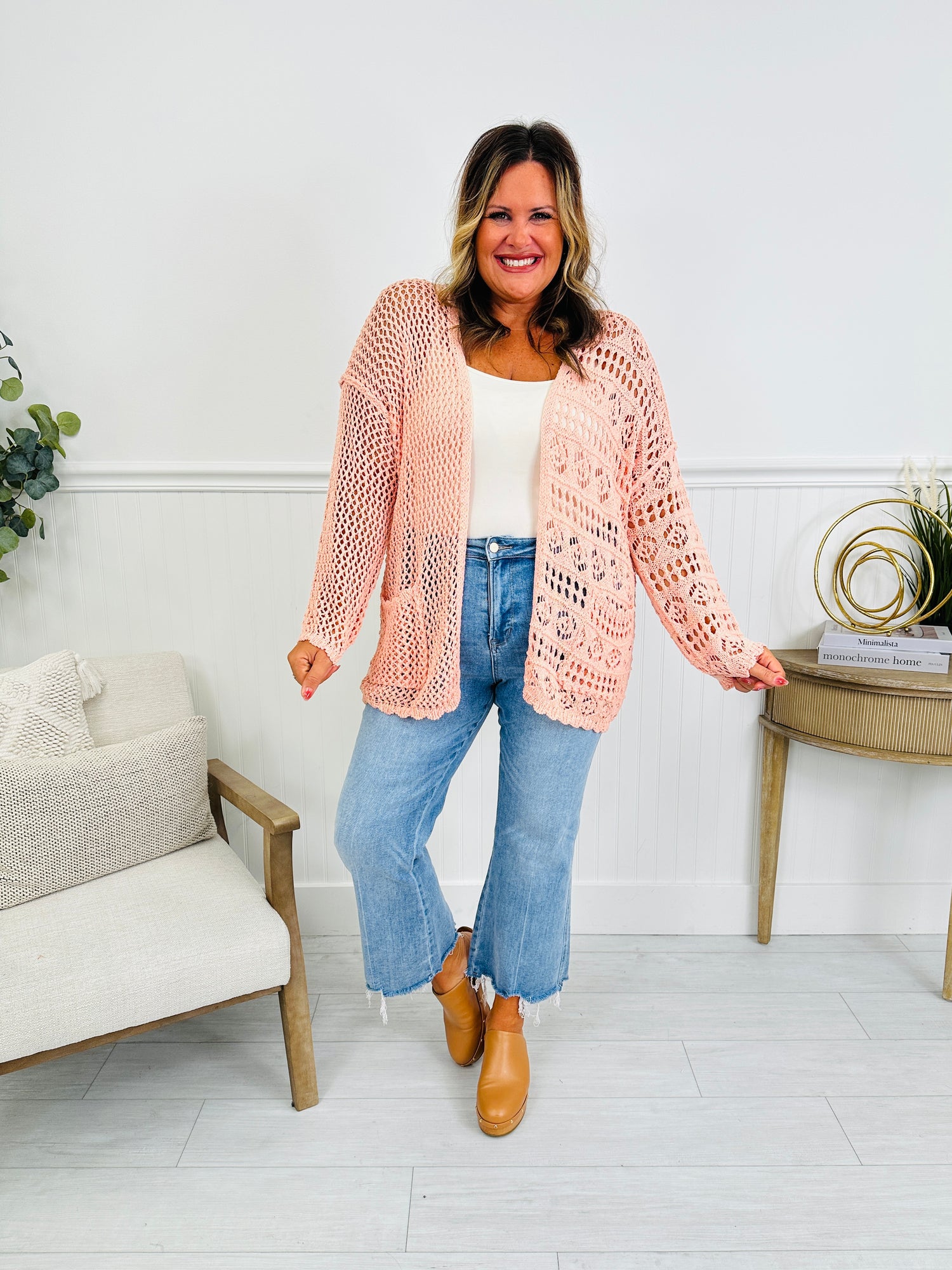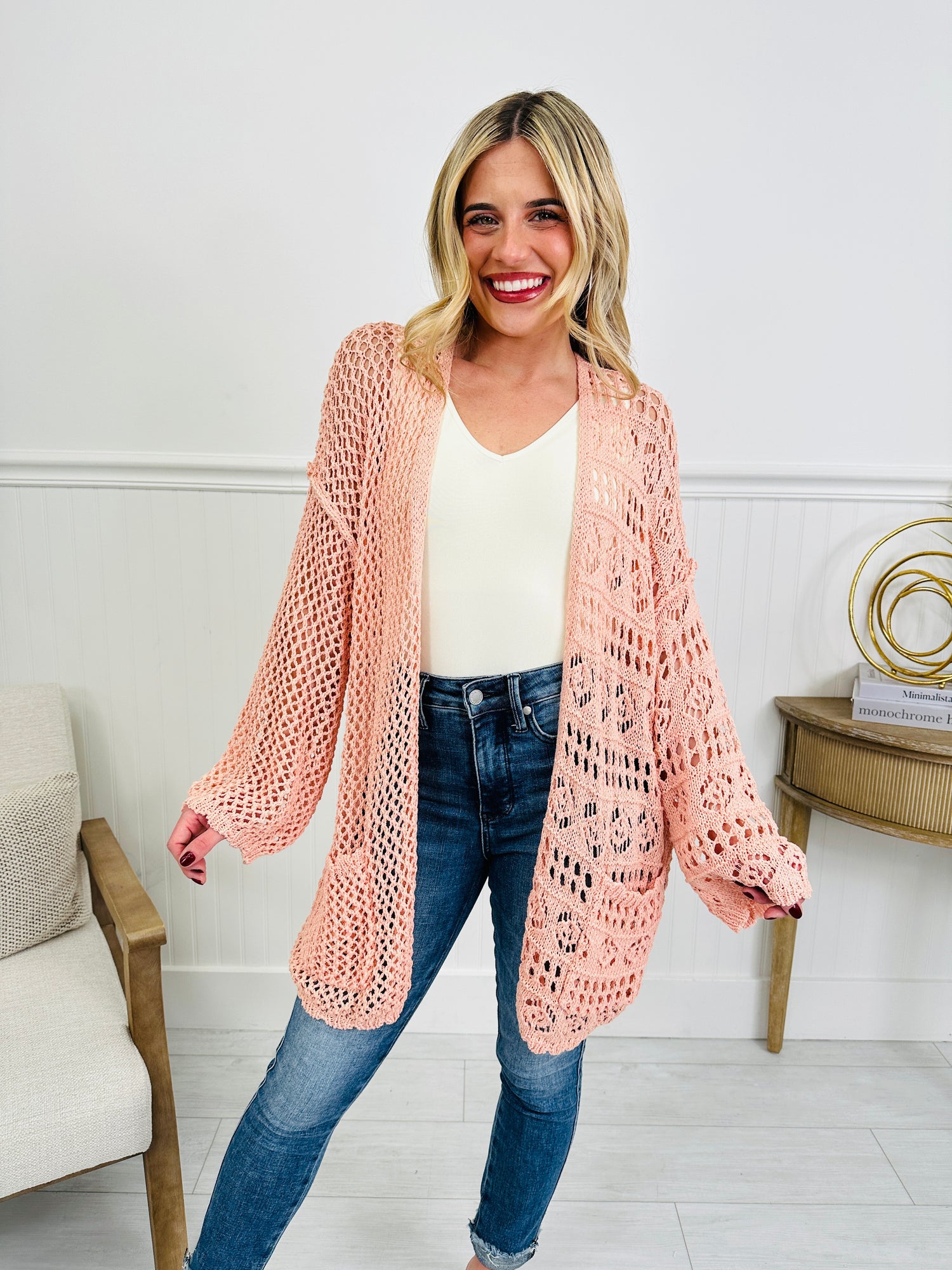 This new pre-spring cardigan is light, airy, and made for effortless layering in the upcoming season. This cardigan features a beautiful open-knit crochet design that adds the perfect touch of texture to any outfit. With its relaxed fit and soft, lightweight feel, this cardigan is ideal for transitioning seasons and warm-weather days.
