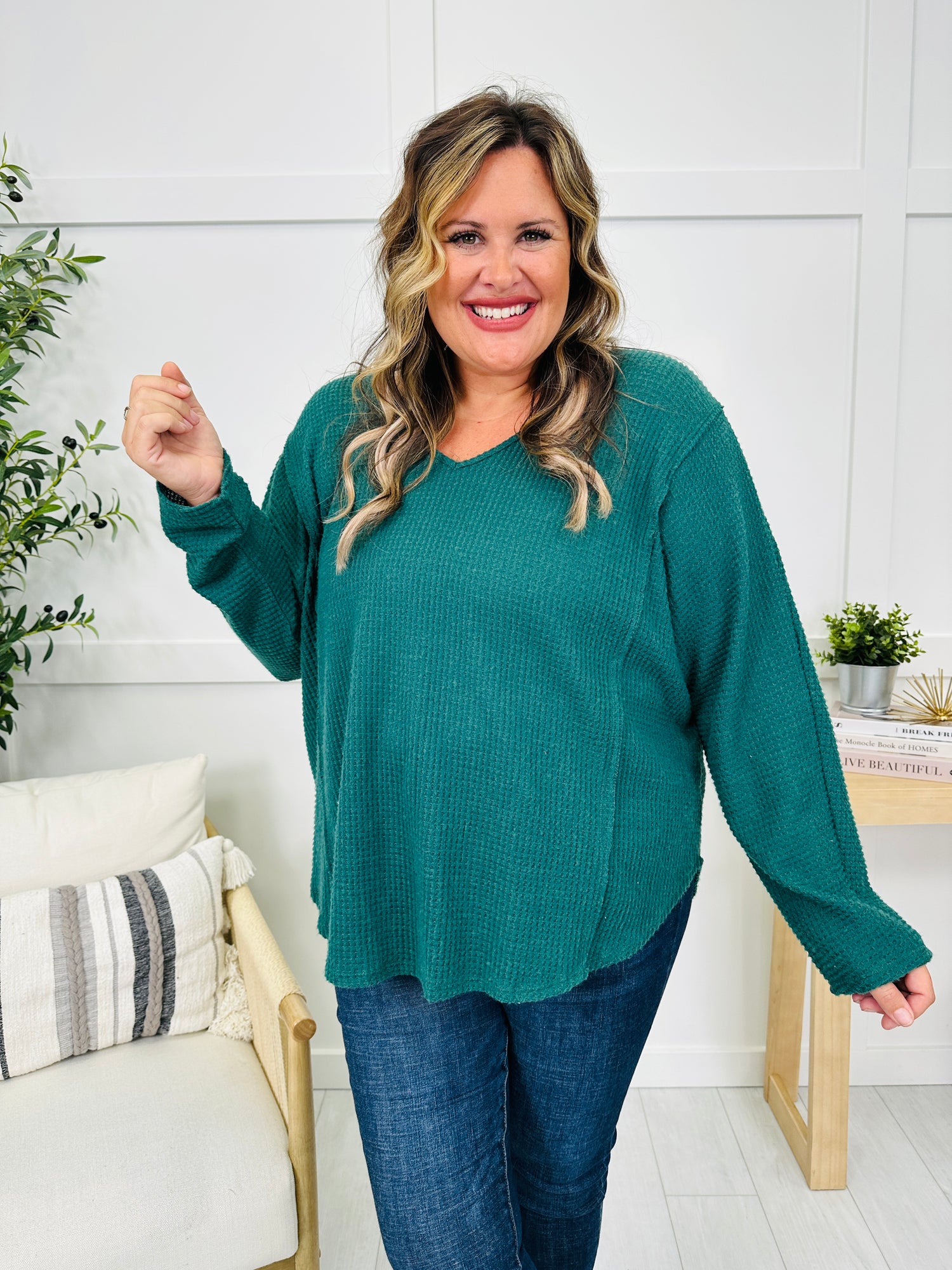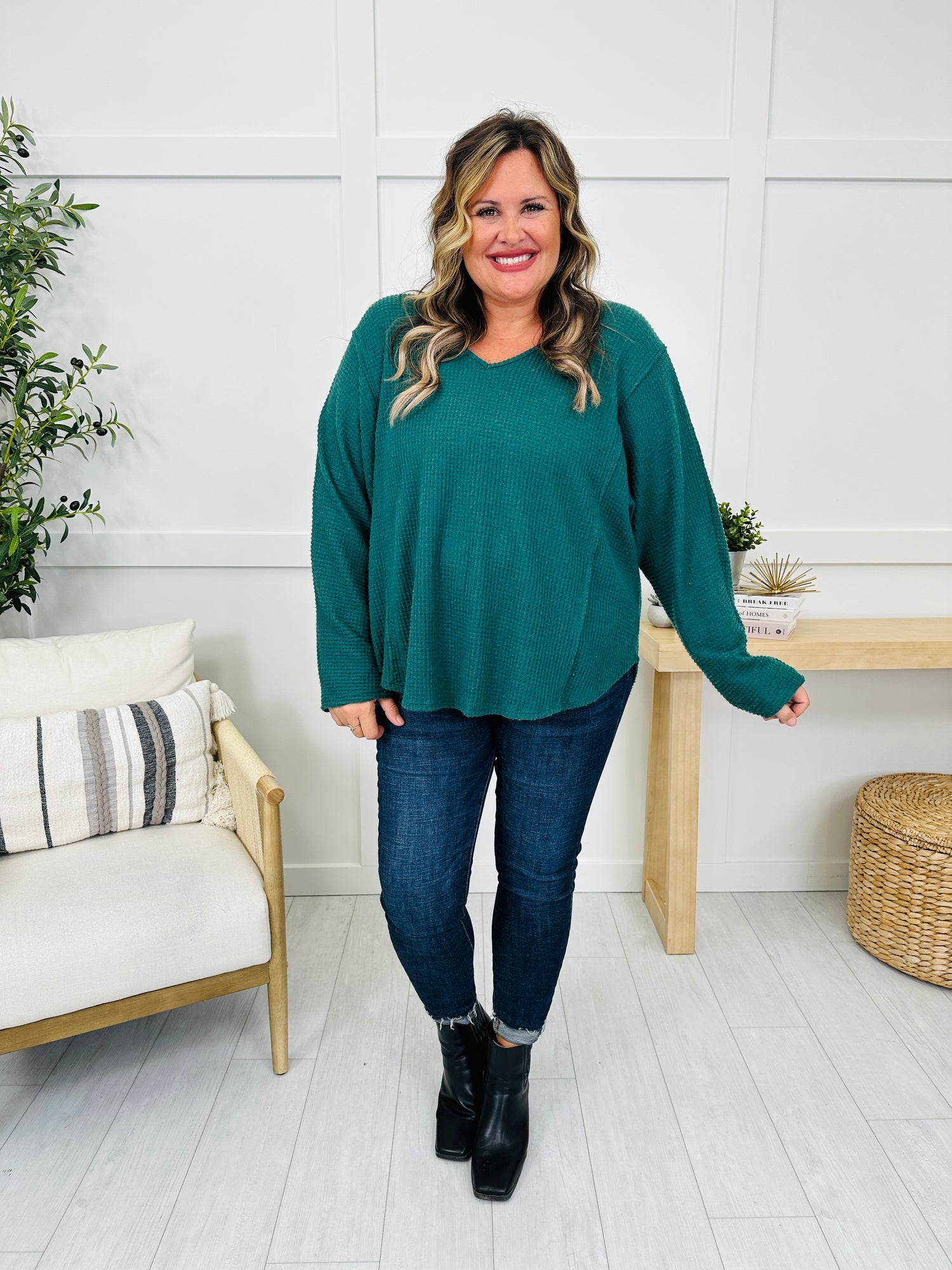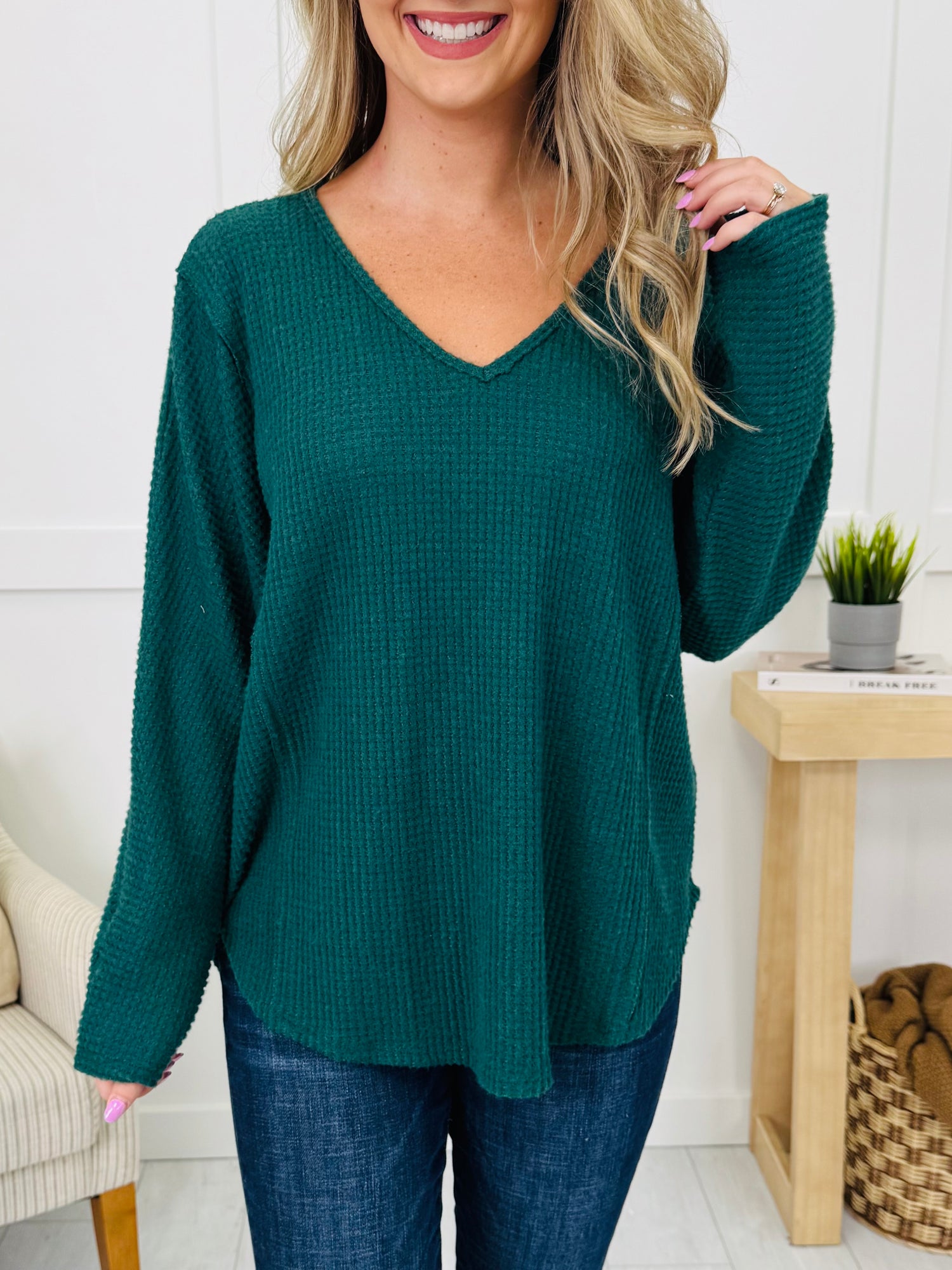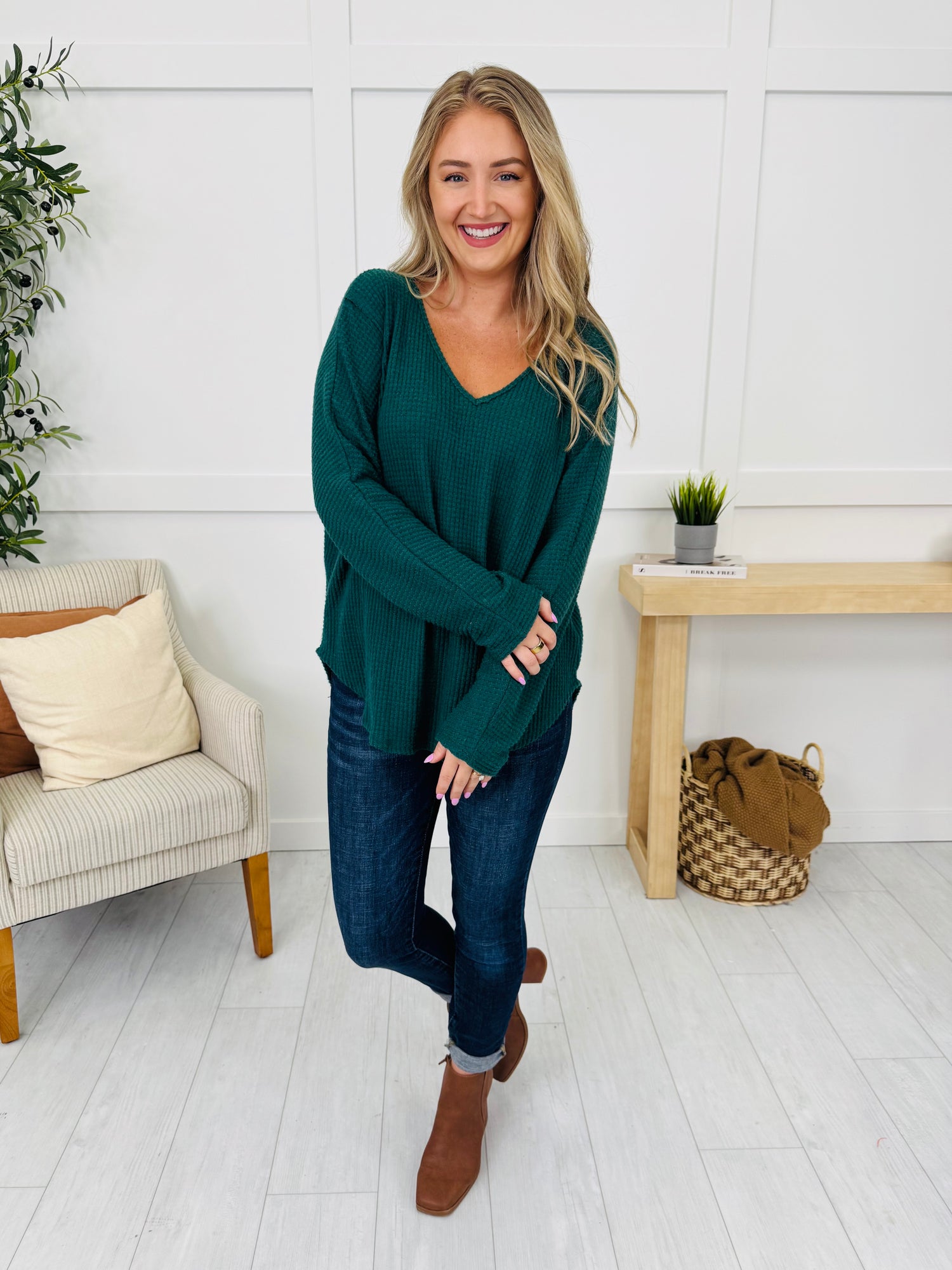 This top features a textured knit feel with a relaxed easy fit that drapes effortlessly. The classic V neckline keeps the look simple and wearable, making it ideal for everyday styling. Finished with long sleeves and a softly rounded hem, it’s a comfortable go-to that can pair with denim or leggings alike.