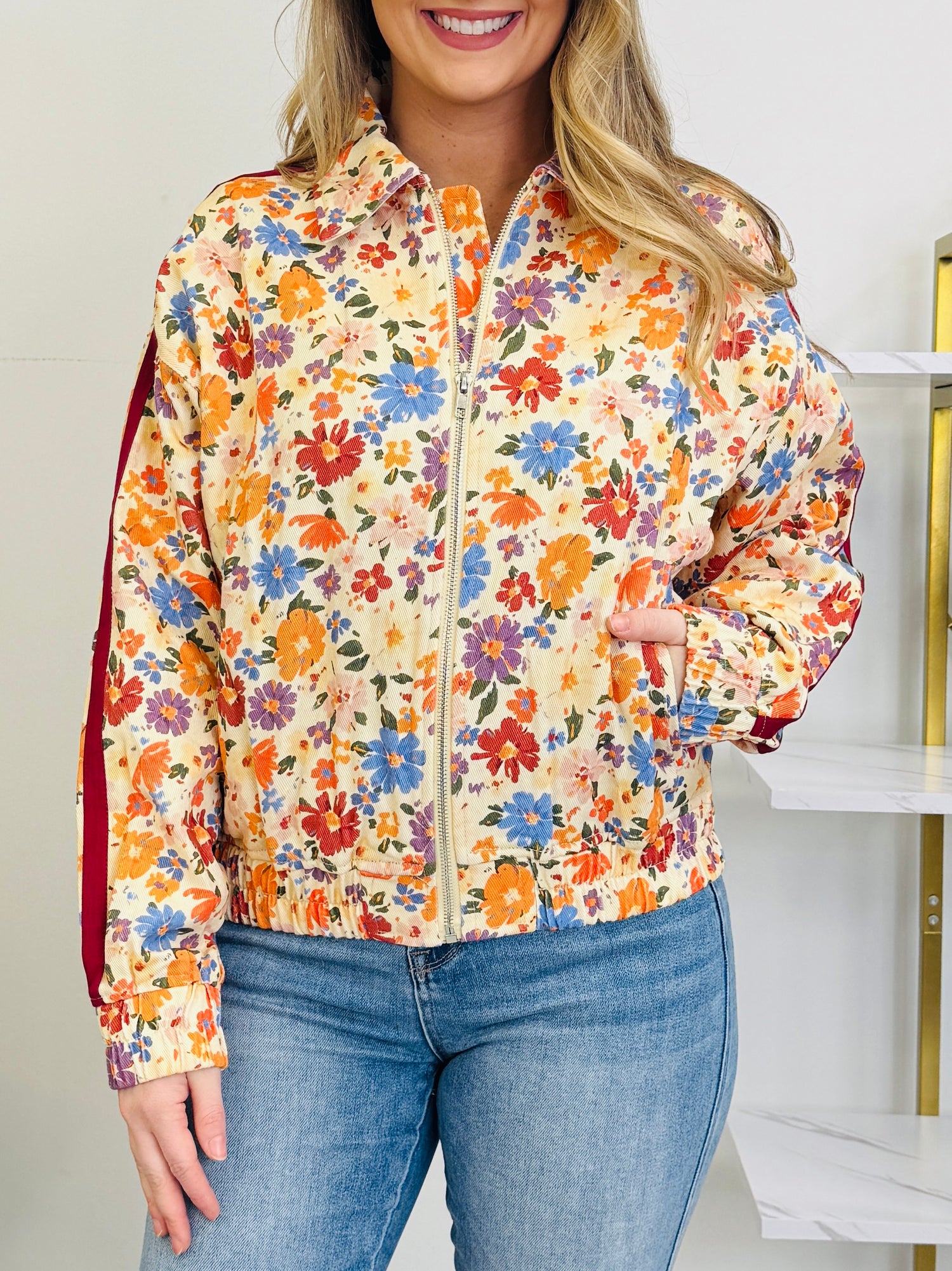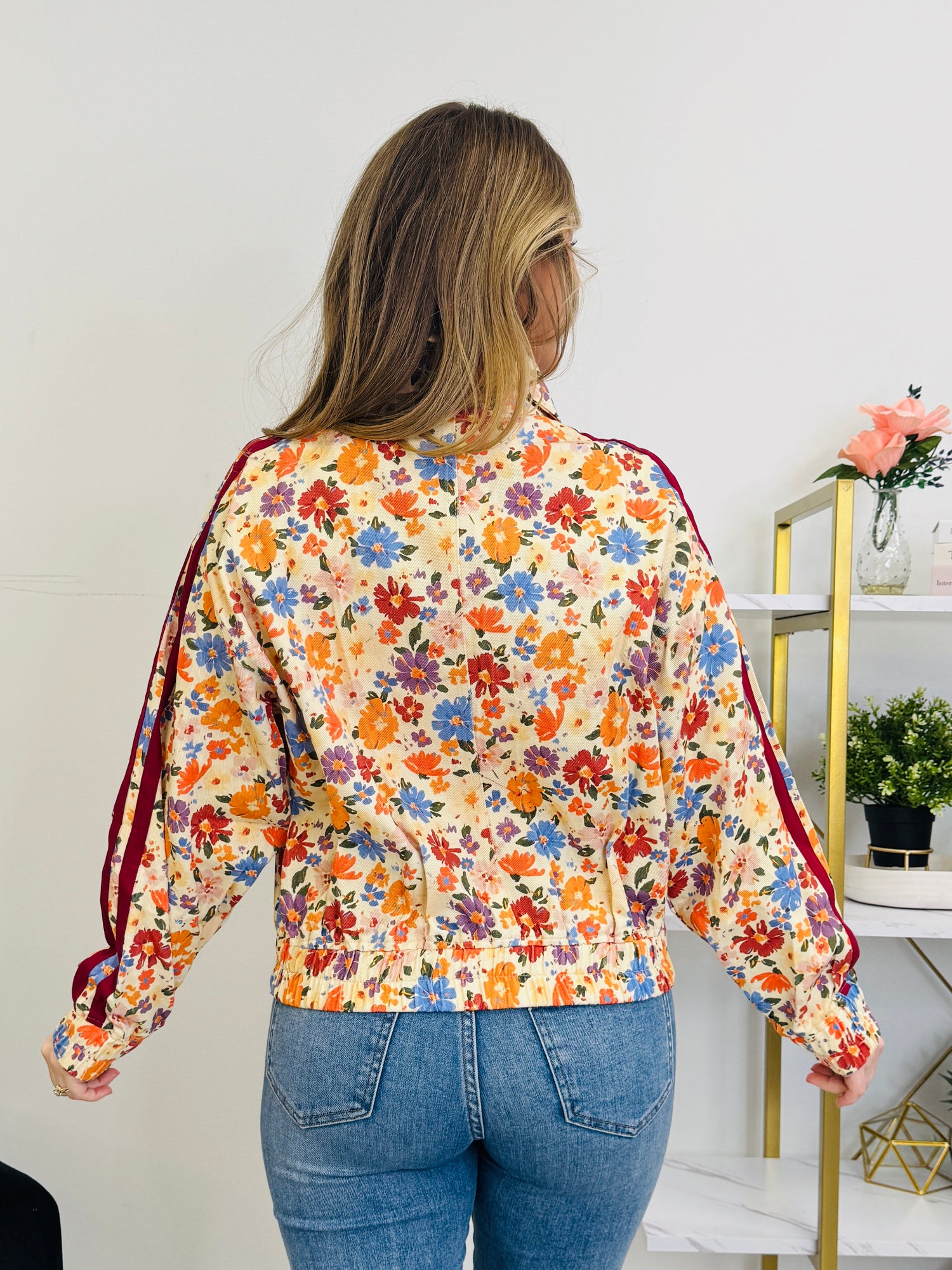 This floral zip-up jacket is an instant outfit-brightener, finished with a crisp collar and a full-length zipper down the front. The bold contrast stripe along the sleeves adds an extra pop, while the gathered hem and cuffs give it a neatly finished look. Plus, the side pockets are perfect for keeping your hands cozy or stashing the little essentials.