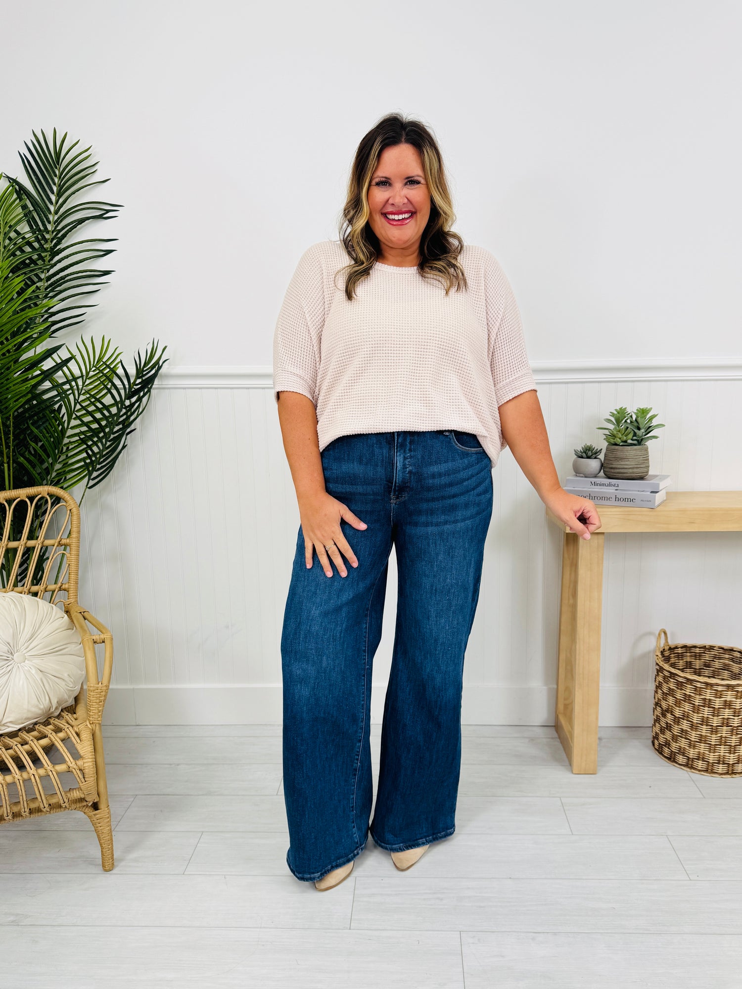 Finally! A wide leg jean that was created especially for you and available in four inseams! These dreamy jeans feature a high rise with a tummy control panel that is going to suck you in and slim you out in all the right places without sacrificing stretch or comfort.