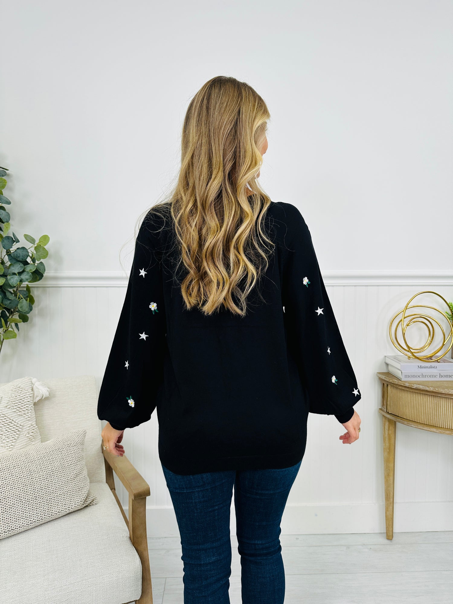 This top brings all the whimsy with scattered star accents and sweet embroidered daisies that instantly brighten the look. The relaxed silhouette fits with an easy, comfy feel, making it perfect for days when you want style without effort. With statement sleeves and the cutest mix of patterns, it’s a fun pick for denim, joggers, and everything in between.