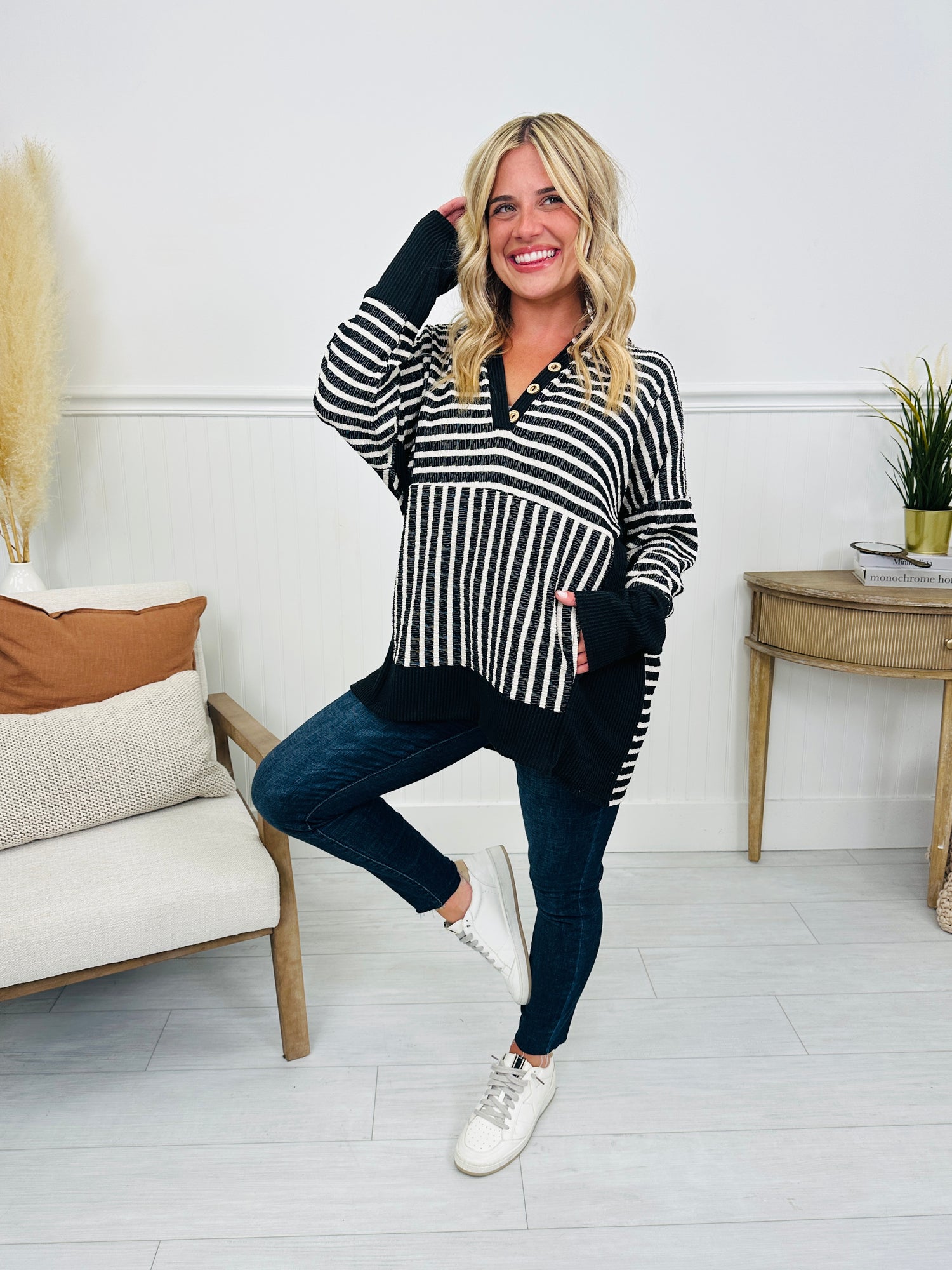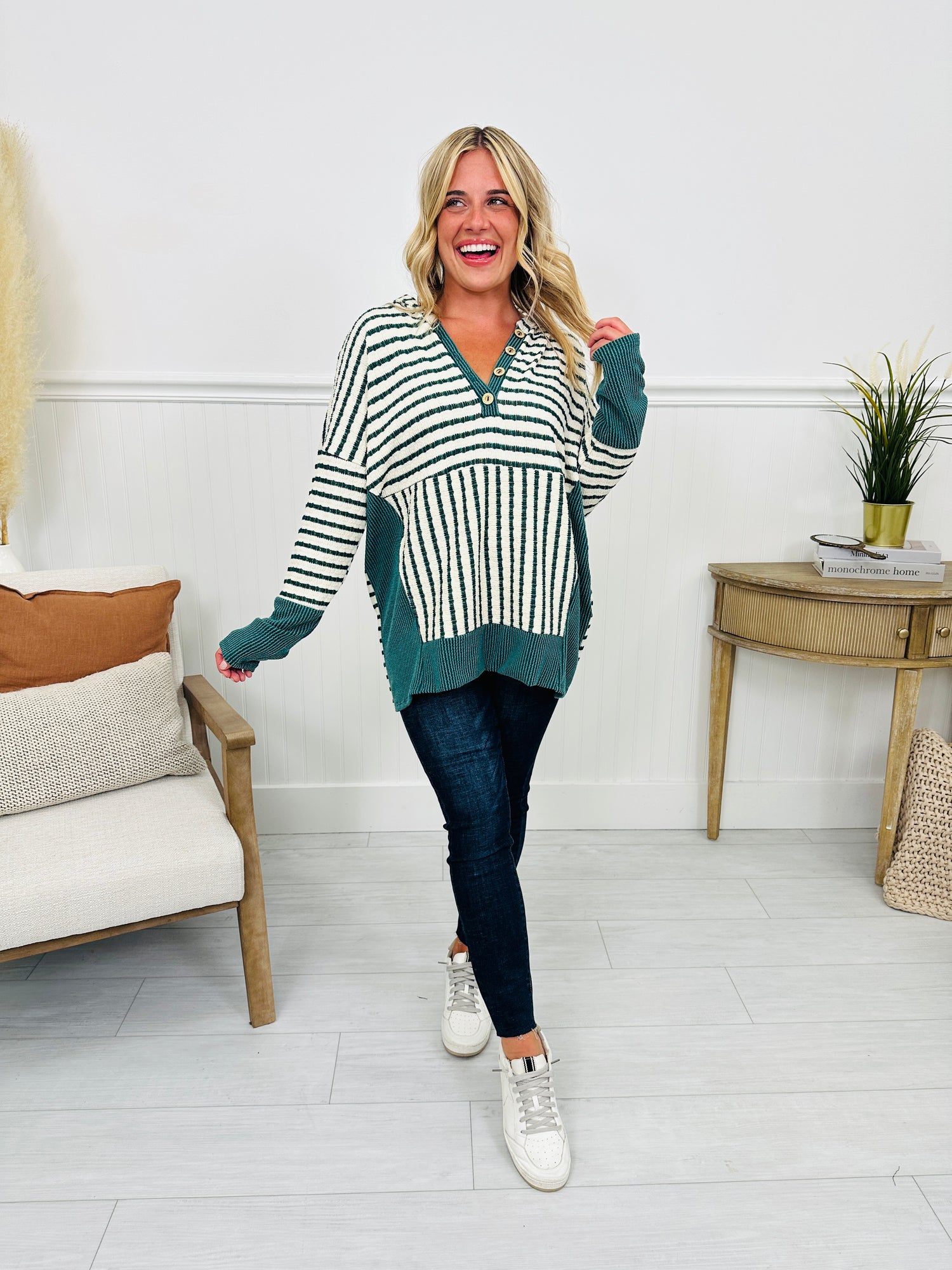 You are going to be falling for this new hoodie from the second you put it on! This top is part of our fall collection, and it is perfect for transitioning into the cooler months. It's made from two of our best selling fabrics: out stretchy raised rib fabric and our brushed, buttery soft textured fabric. This is the comfiest hoodie you will ever own! It is perfect to pair with both jeans and leggings, making it a versatile addition to your wardrobe. We love the functional buttons that can be worn open or closed. Fall for this new arrival ;) and add it to your cart before it's gone!