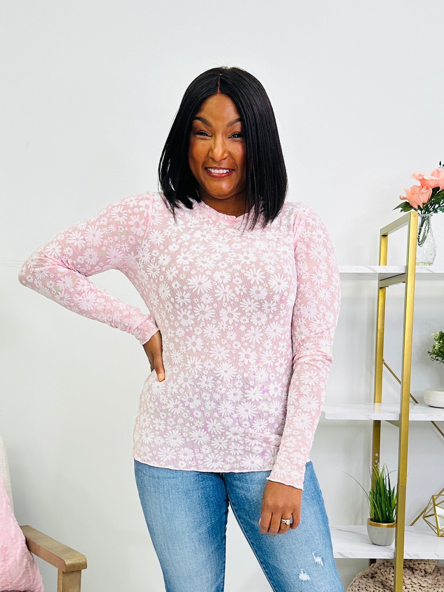 This long sleeve top brings a bright, playful feel with its cheery daisy print layered over a soft pastel tone. The lightweight, fitted style makes it easy to wear on its own or under cardigans and jackets while still keeping a smooth silhouette. Finished with subtle hems and a classic neckline, it's a feel-good piece you'll reach for again and again.