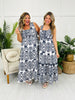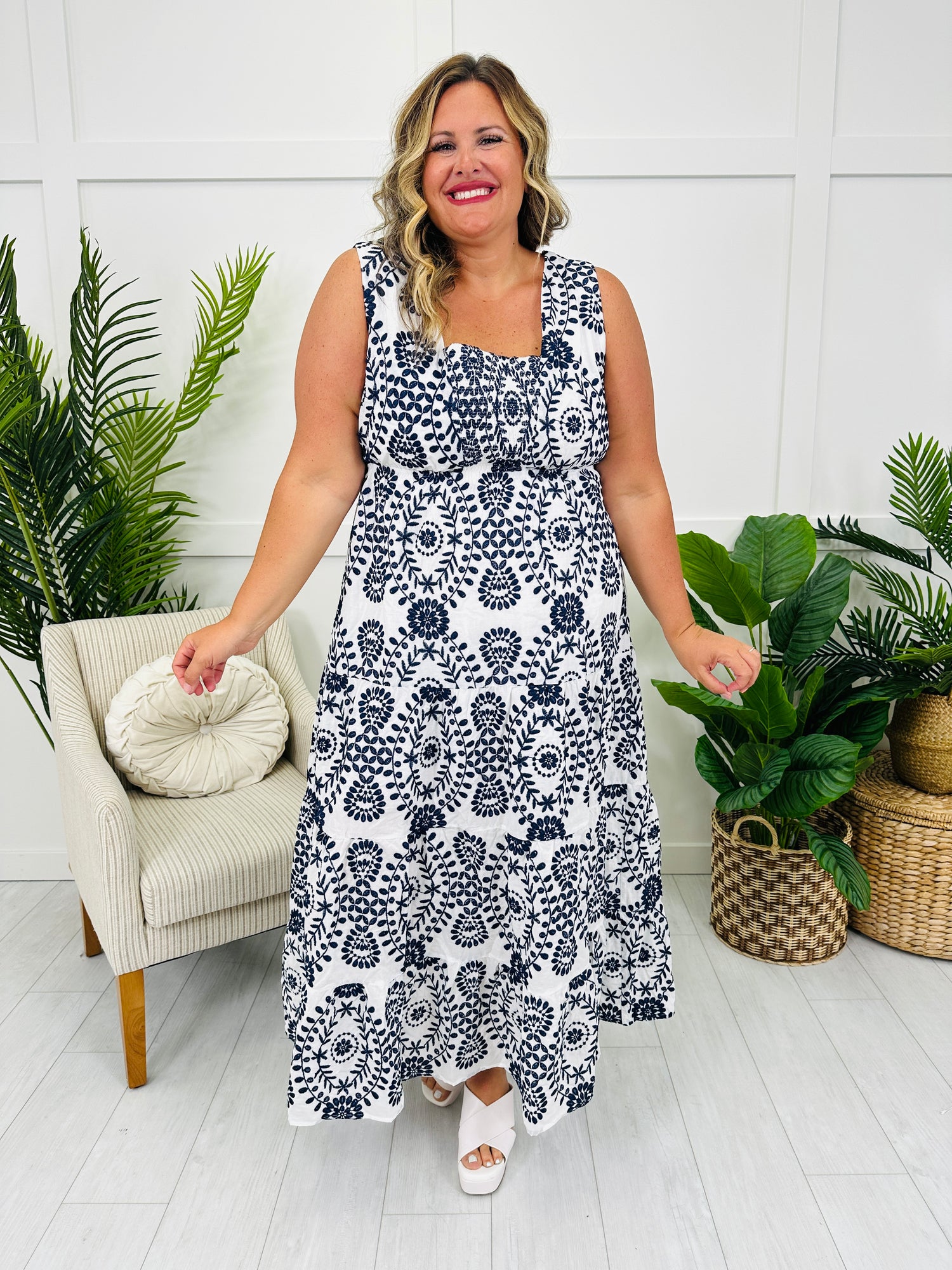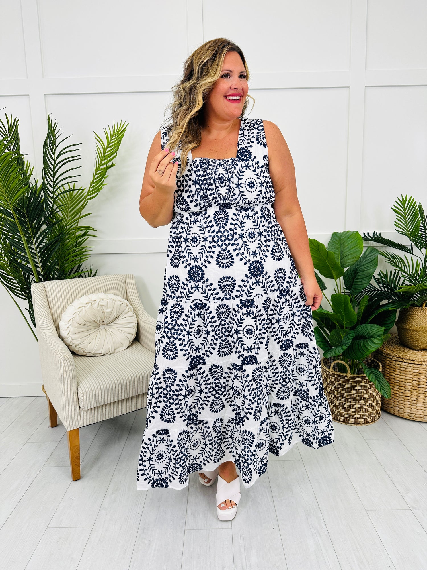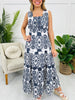 This dress combines timeless style with a playful twist. The square neckline and smocked bodice shape your silhouette, while the tiered skirt adds flow and movement. The cut-out back, tied with a bow, adds a fun element, making this dress perfect for sunny days or casual outings. The floral print in navy and white gives it a fresh, easy-to-wear vibe, complementing the relaxed fit.