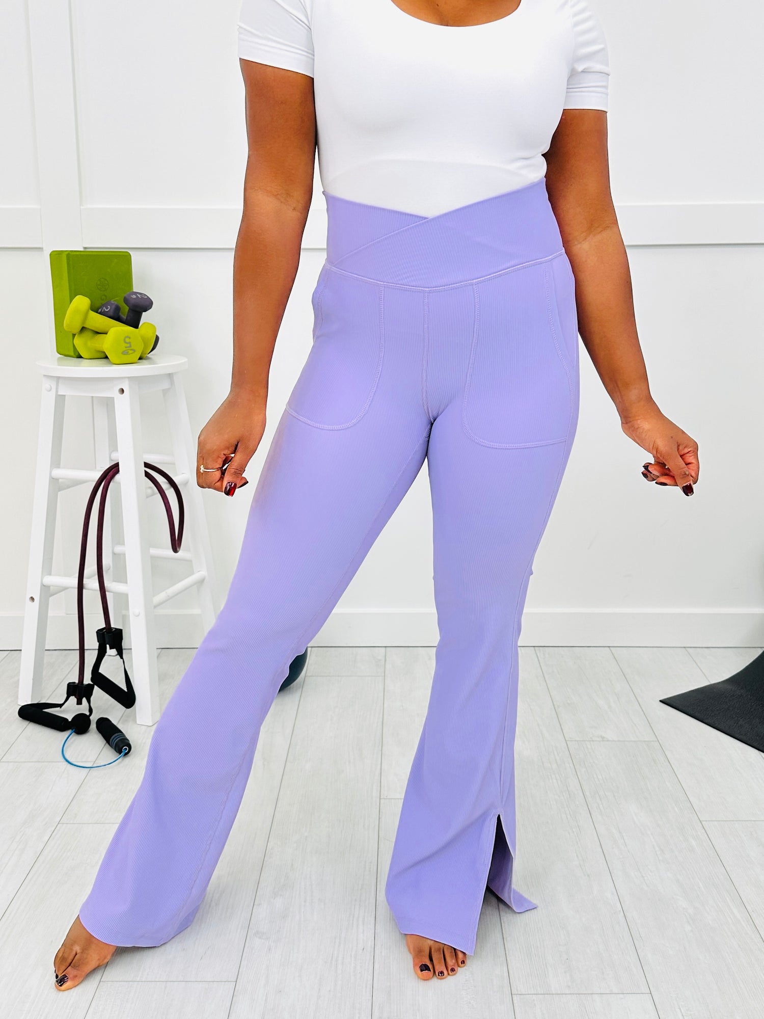 These yoga pants bring all the flattering vibes with a crossover waistband detail, a sleek flare leg finished with slit hems, and handy front patch pockets for an elevated, sporty look. The vertical texturing adds a little extra detail while keeping the silhouette clean and elongating. They come in several stunning colors to elevate your athletic and athleisure wardrobes.