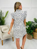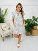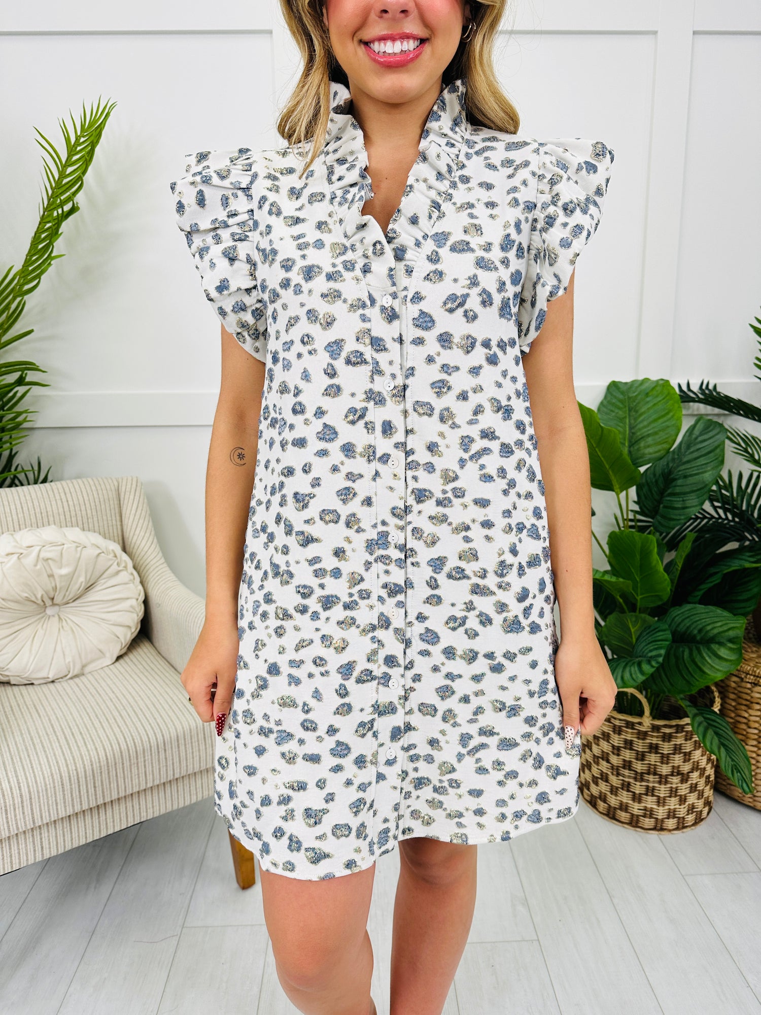 This dress features a bold leopard print, elevated with embroidered gold threading that adds a subtle shimmer. The button-down design is complemented by ruffled cap sleeves and a v neckline, creating a perfect balance of chic and playful. Whether you're dressing it up or keeping it casual, this dress brings a touch of glam to your wardrobe with effortless style.