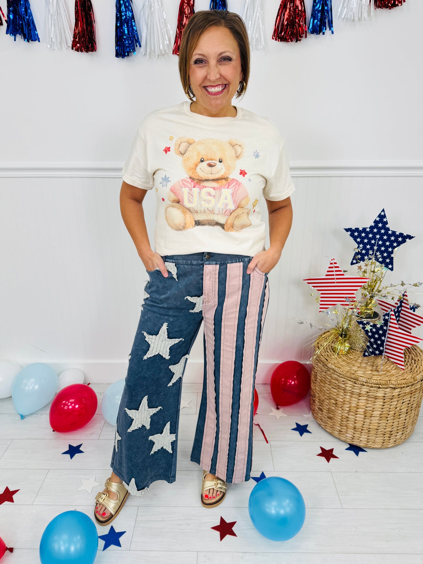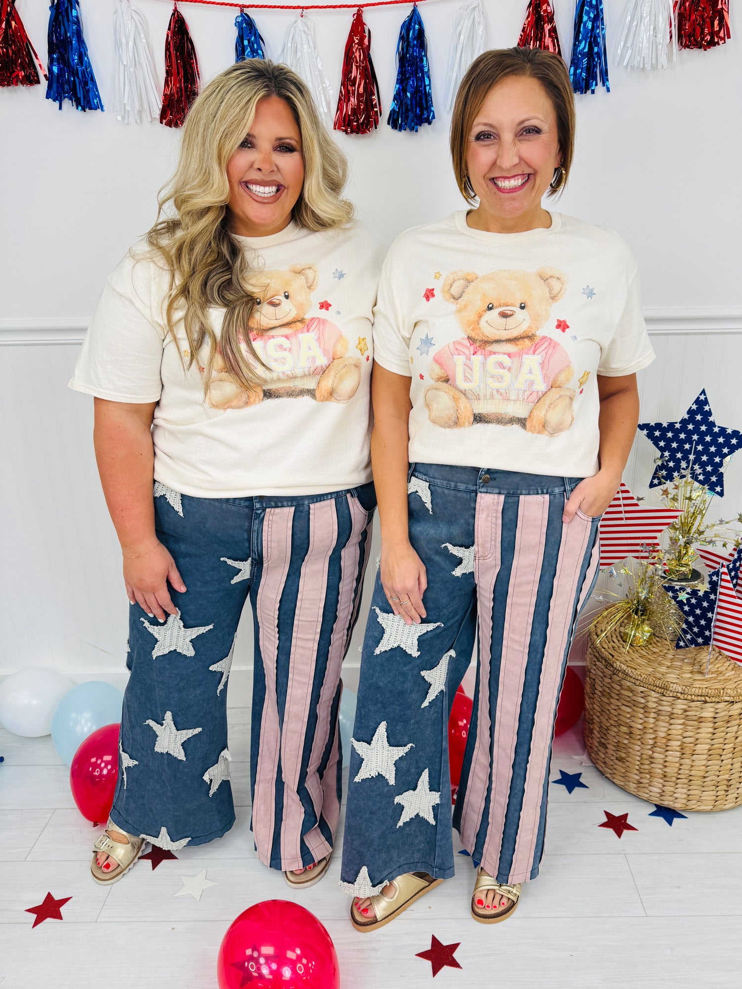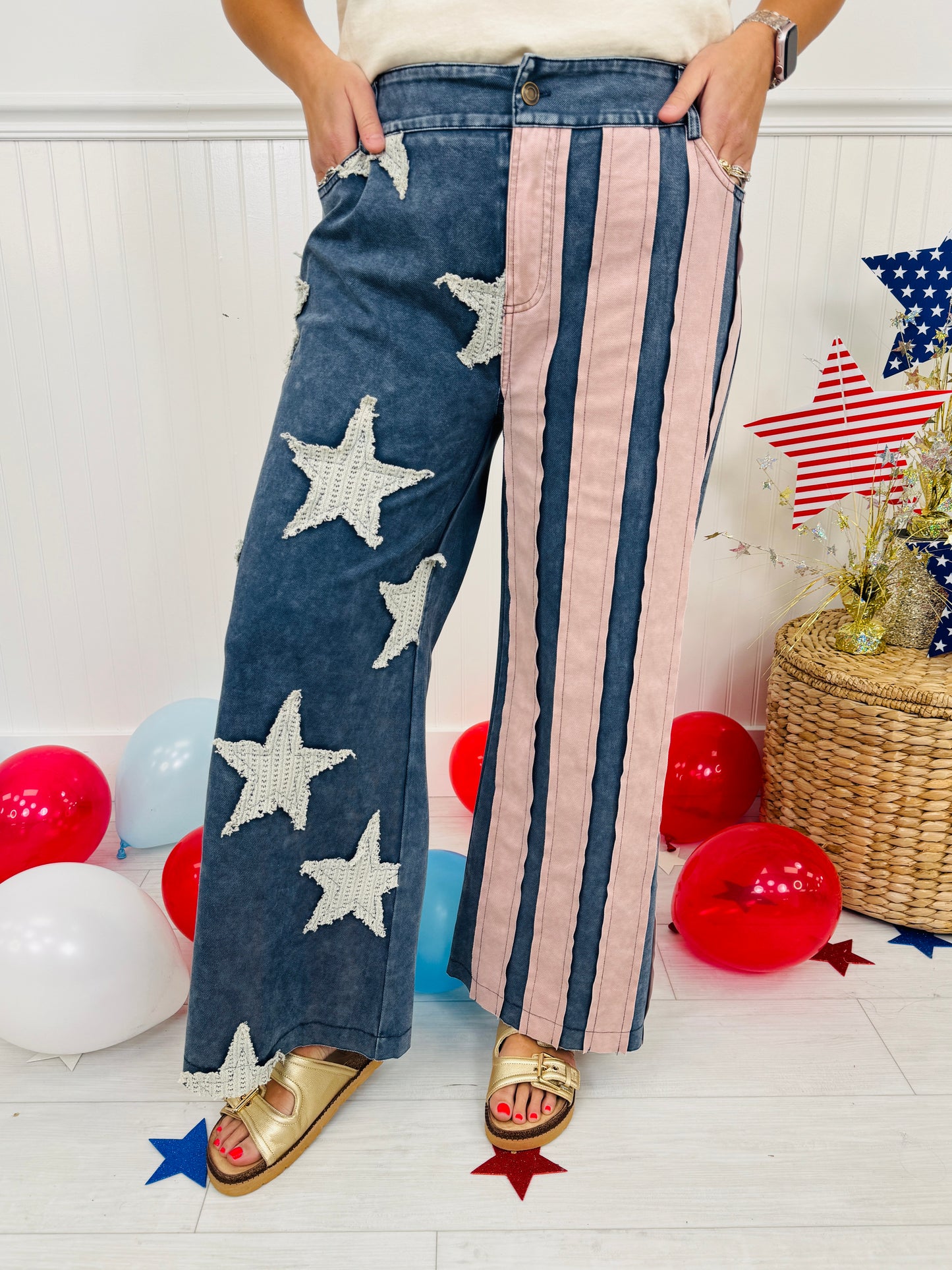 These trendy wide-leg denim pants feature a bold, patriotic design with embroidered stars and a stylish striped side panel. The relaxed fit and soft fabric make them perfect for staying comfortable while showing off your fun, festive side.
