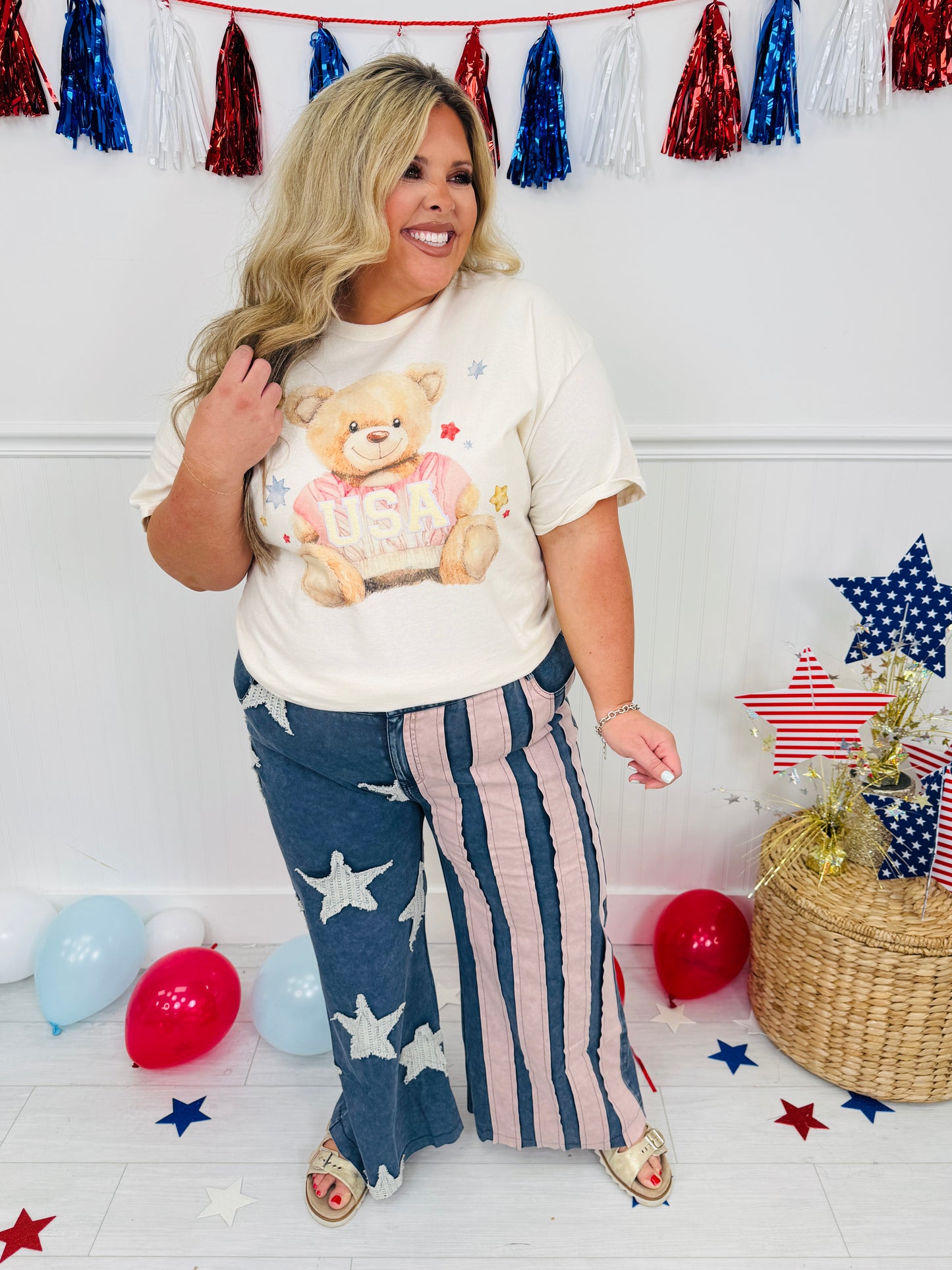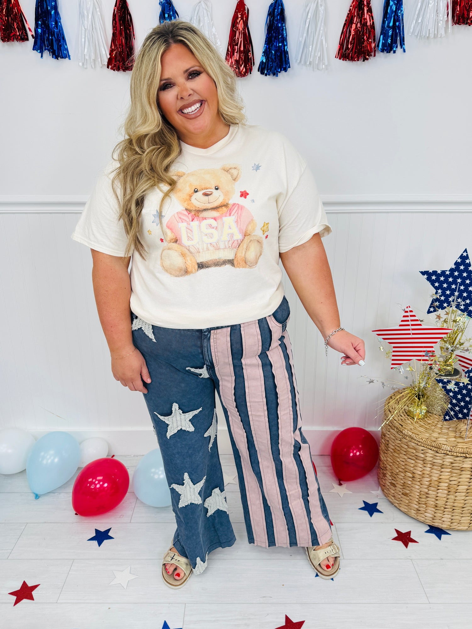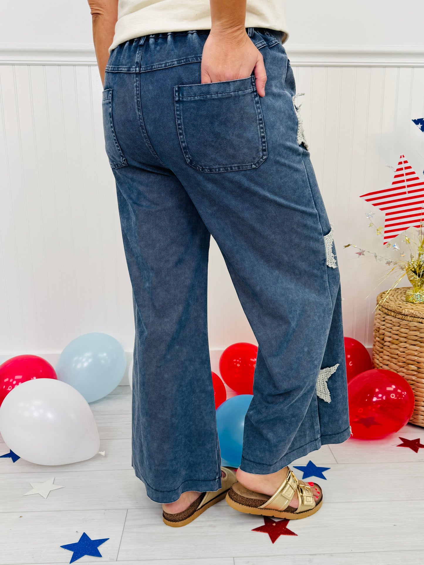 These trendy wide-leg denim pants feature a bold, patriotic design with embroidered stars and a stylish striped side panel. The relaxed fit and soft fabric make them perfect for staying comfortable while showing off your fun, festive side.