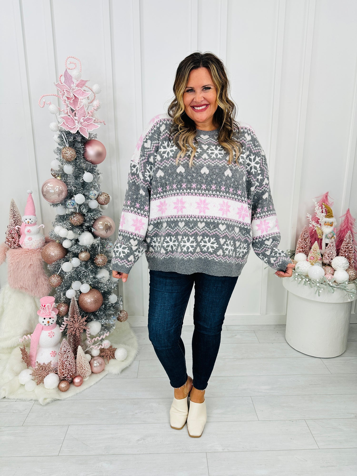 Cozy up this winter in this new arrival that is sure to give you all the frosted feelings this season. This soft and dreamy knit sweater brings all the snowy charm with its winter inspired design featuring delicate snowflakes and hearts in shades of pink, white, and gray.