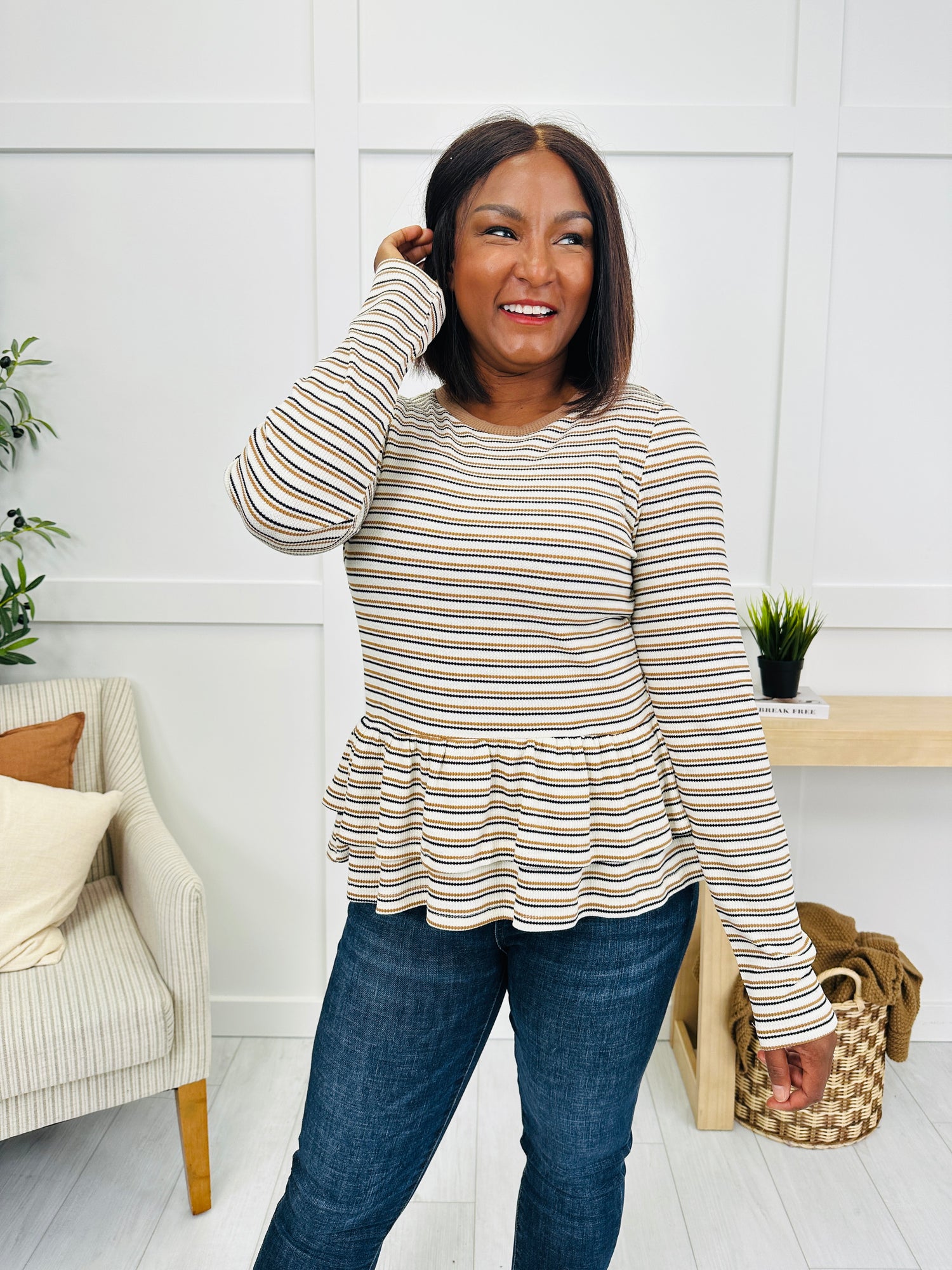 Classic stripes meet playful charm in this effortlessly chic top. The ruffled peplum hem adds a flirty and flattering touch, while the long sleeve design makes it perfect for transitioning through the seasons. Whether paired with jeans for a casual day out or dressed up with accessories, this striped piece brings an easy mix of comfort and style to your wardrobe.