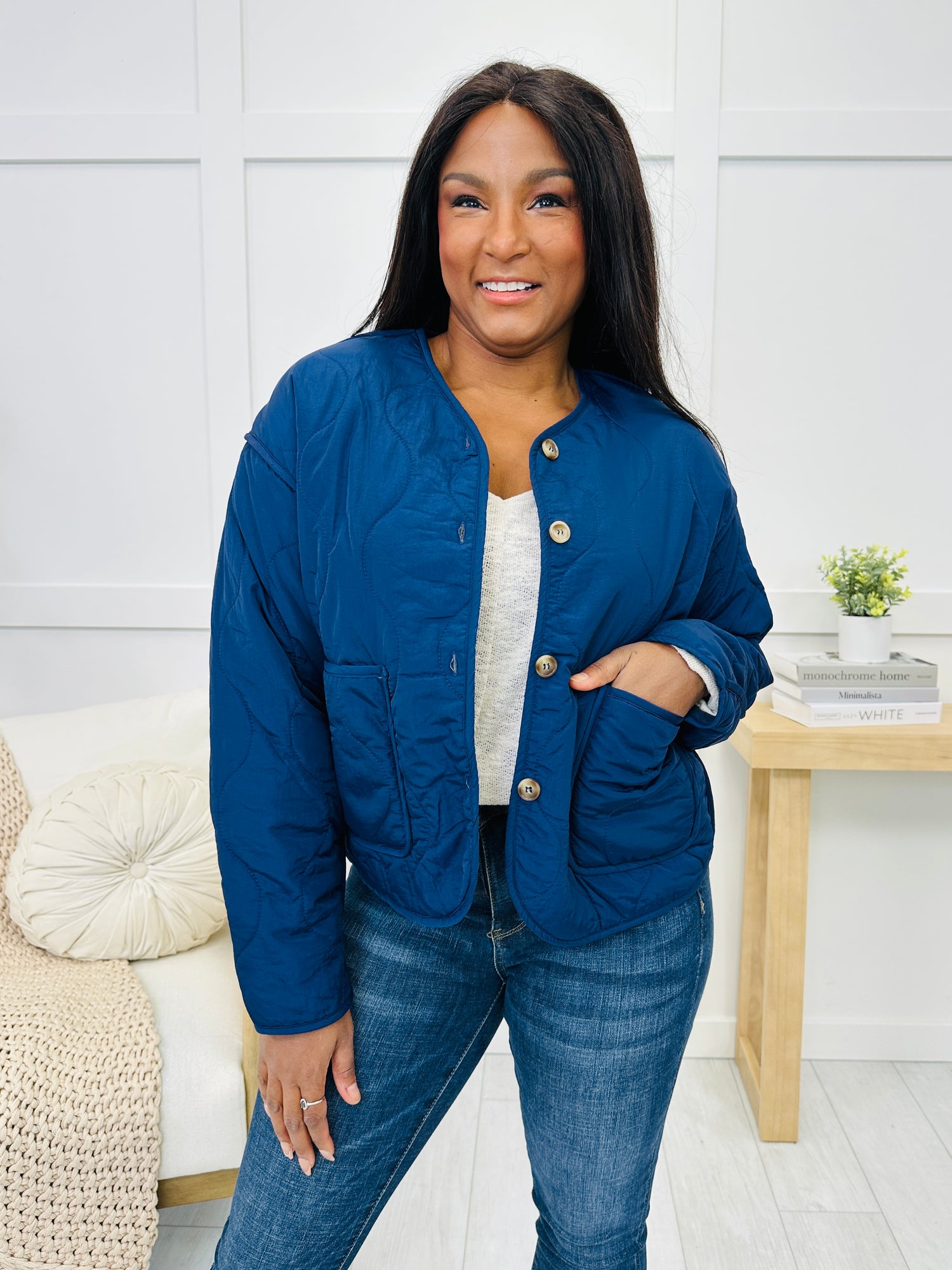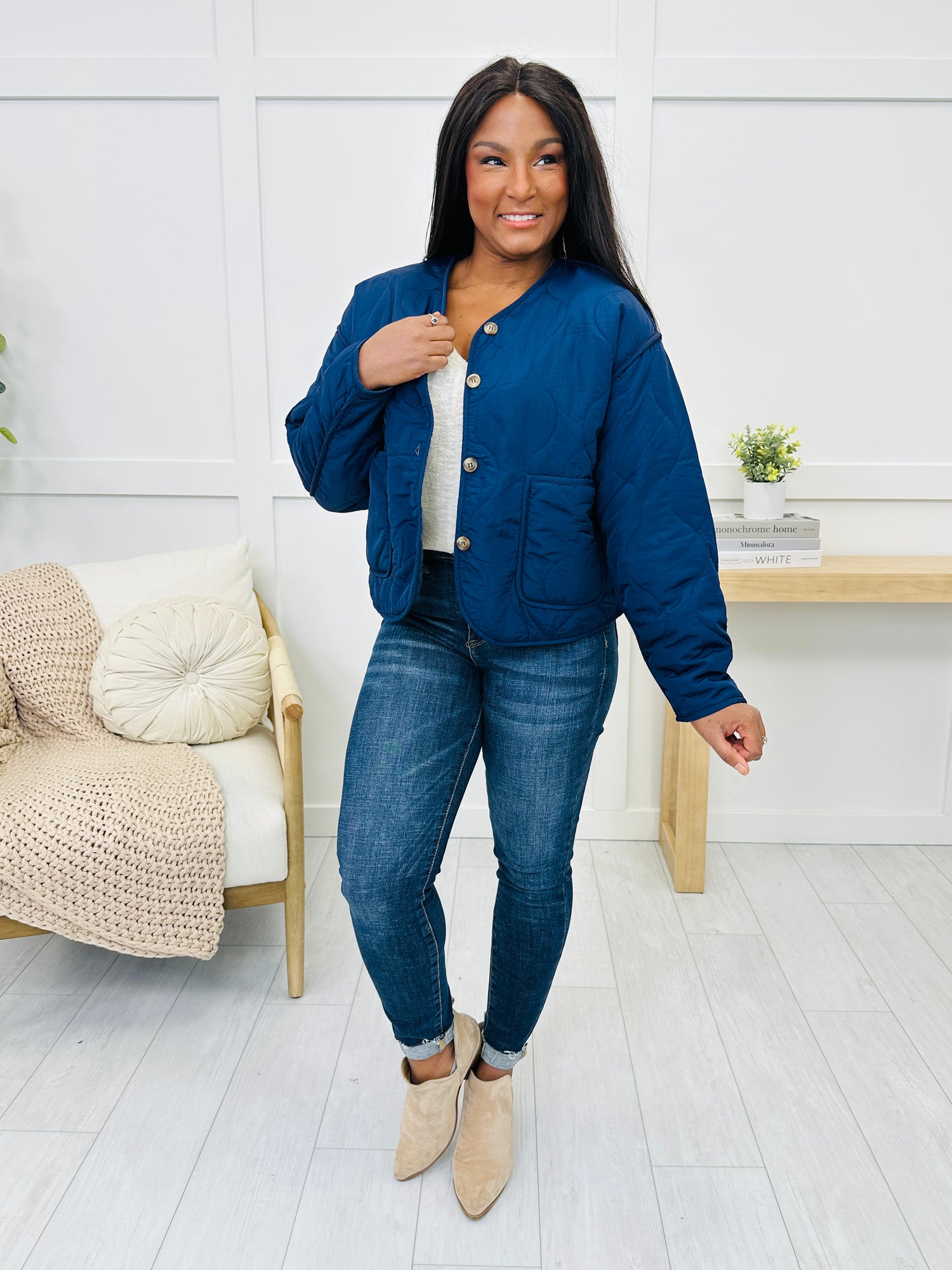 This stylish jacket features a quilted design in a gorgeous navy hue that adds texture and warmth, making it perfect for layering. The button-down closure and functional front pockets add both style and practicality, while the relaxed fit ensures comfort throughout the day. Ideal for transitioning between seasons, this versatile jacket pairs easily with jeans or leggings for an effortlessly chic look.