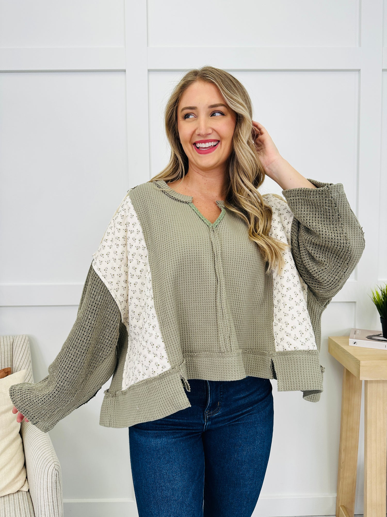 This top brings together cozy texture and sweet charm with its soft knit body and dainty floral contrast panels. The exposed seam details add a touch of laid-back edge, while the relaxed shape makes it an easy, everyday go-to. It’s the perfect mix of casual and cute for effortless styling.
