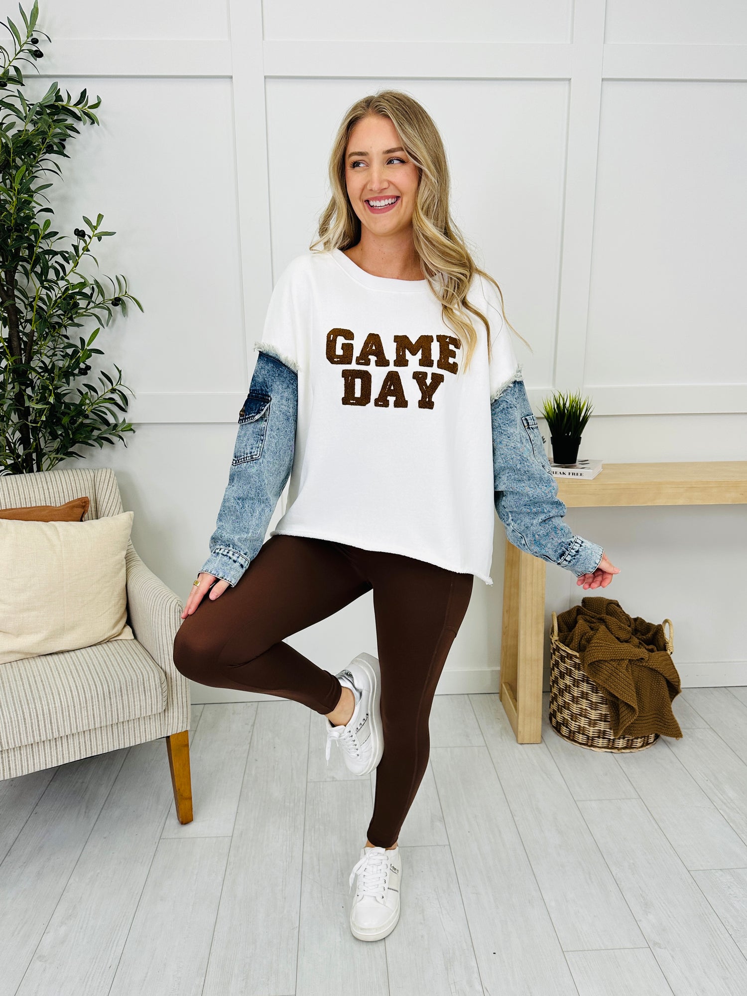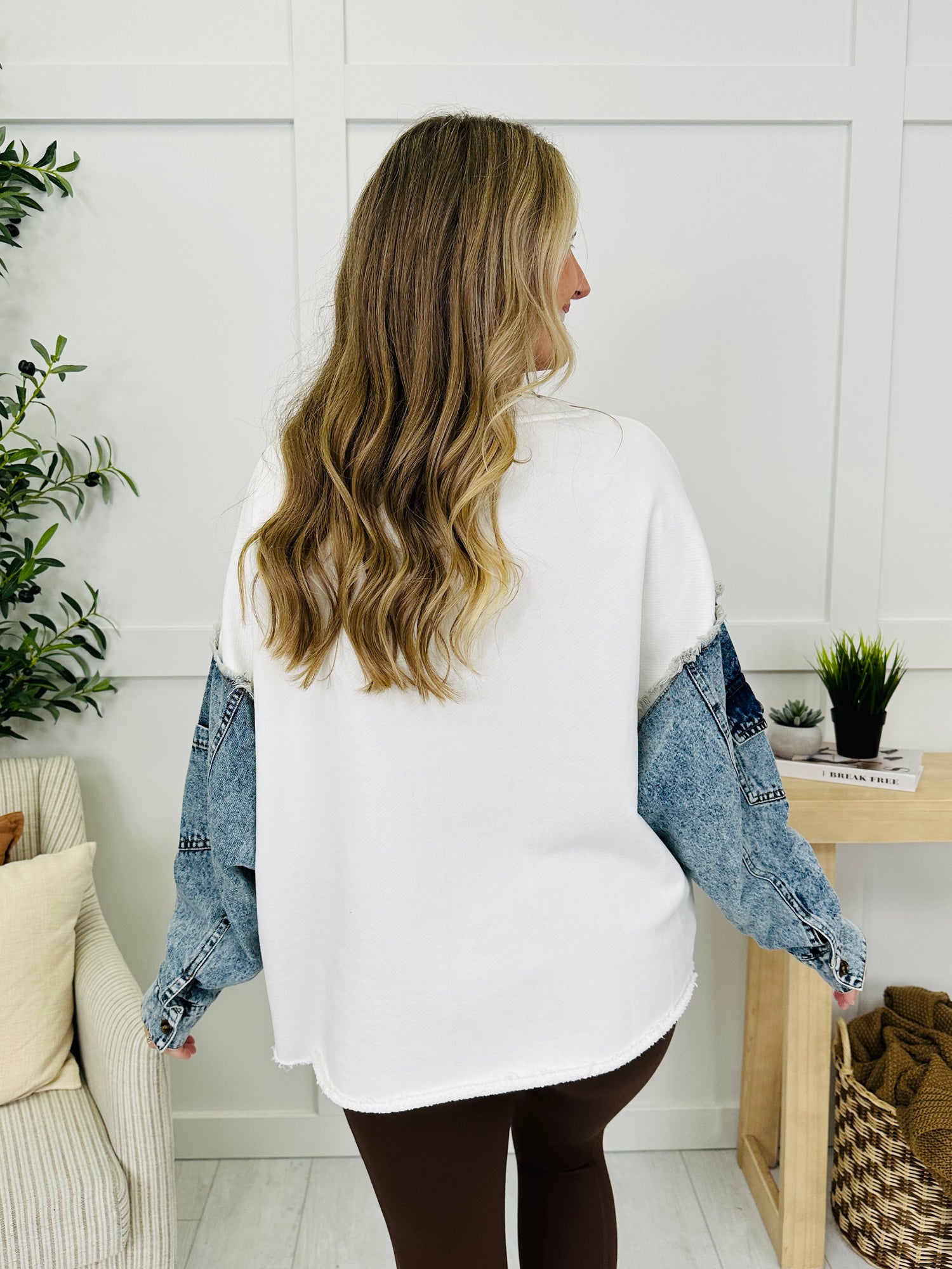 This top is all about spirit and style, featuring bold textured letters across the front that instantly stand out. The denim-look sleeves bring a fun, mixed-material detail, while the raw-edge hem keeps the vibe casual and effortless. Perfect for pairing with jeans or leggings, this piece makes showing up in style a breeze.