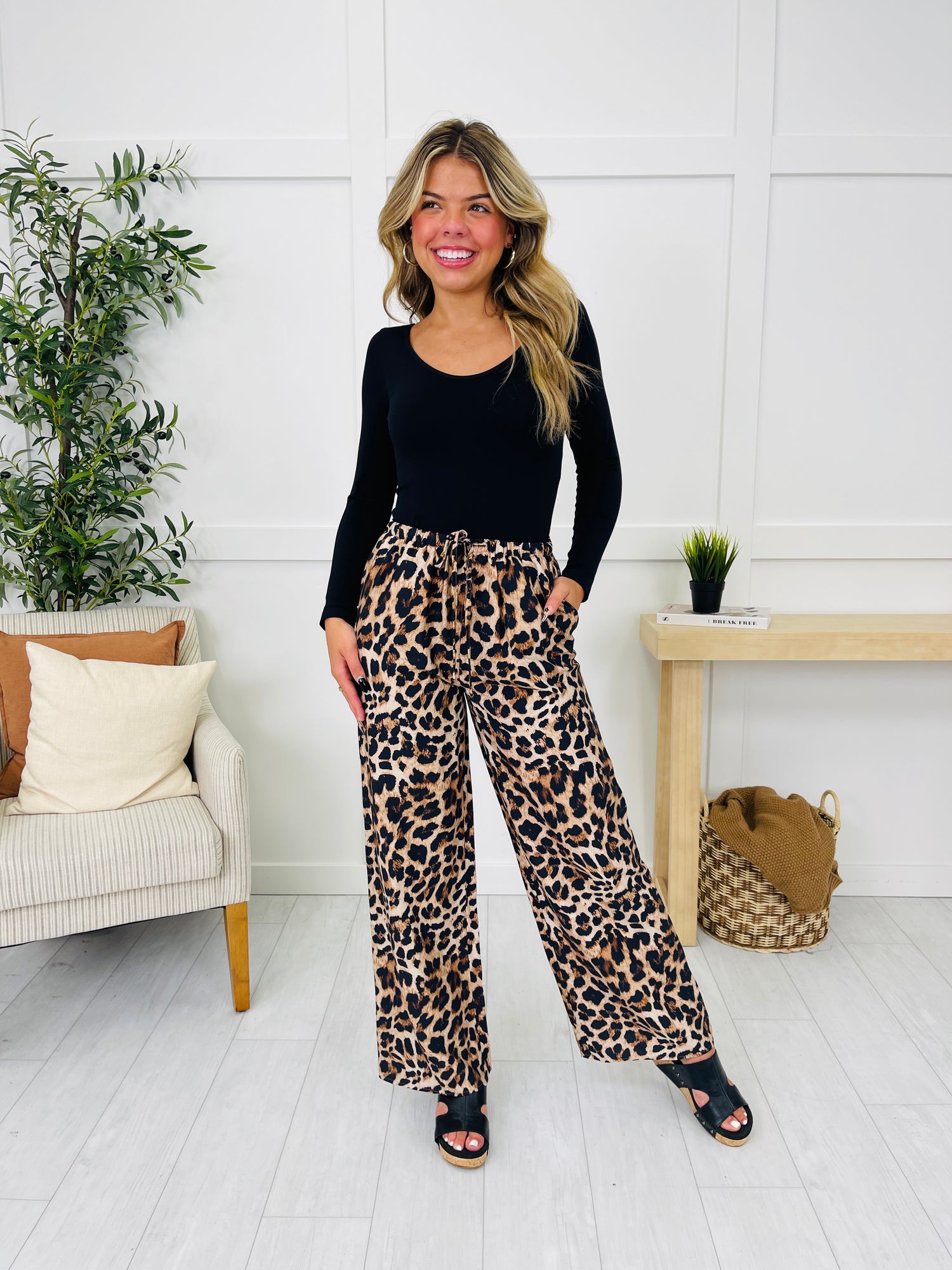 Make a fierce statement with these bold leopard print bottoms that instantly command attention. The lightweight wide leg style creates a flowy, effortless silhouette, while the drawstring waistband adds a comfy, customizable fit. Perfect for pairing with a simple top and booties, these pants bring just the right mix of wild style and laid-back ease.