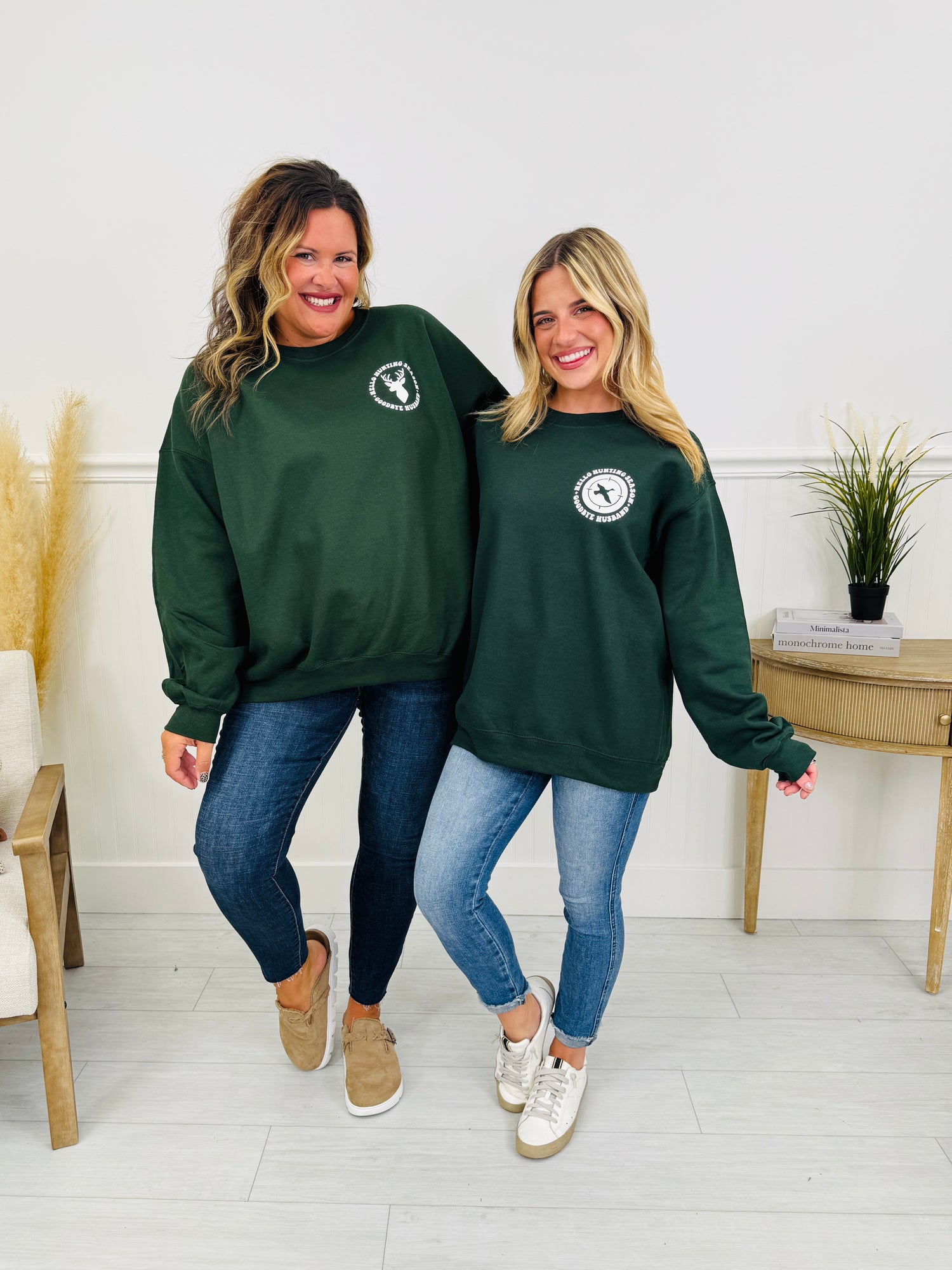 Calling all wives of hunting husbands—this sweatshirt was made for you! This fun new fall arrival is screen printed in house on a cozy Gildan crewneck. The front keeps it simple with a small hunting graphic, while the back makes a bold statement with white lettering that reads: “Hello Hunting Season, Goodbye Husband" in a textured puff print ink.