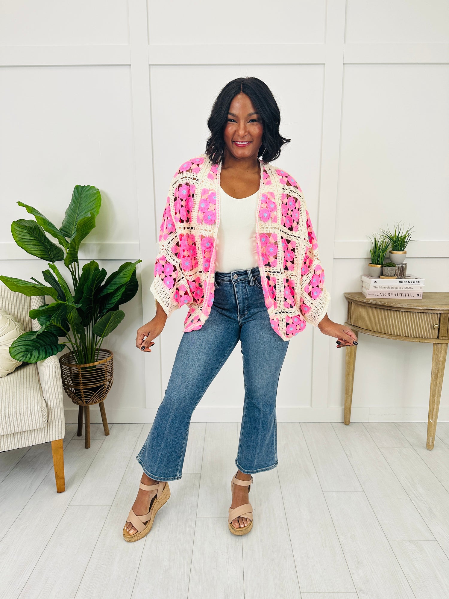 This piece makes a statement with textured floral crochet throughout, featuring raised flower motifs set into a bold square pattern. The open-front design keeps it easy to throw on over your favorite basics, while the drapey wide sleeves give it that effortless, laid-back vibe. With all the openwork detail and eye-catching contrast, it’s the kind of top that instantly elevates a simple look.