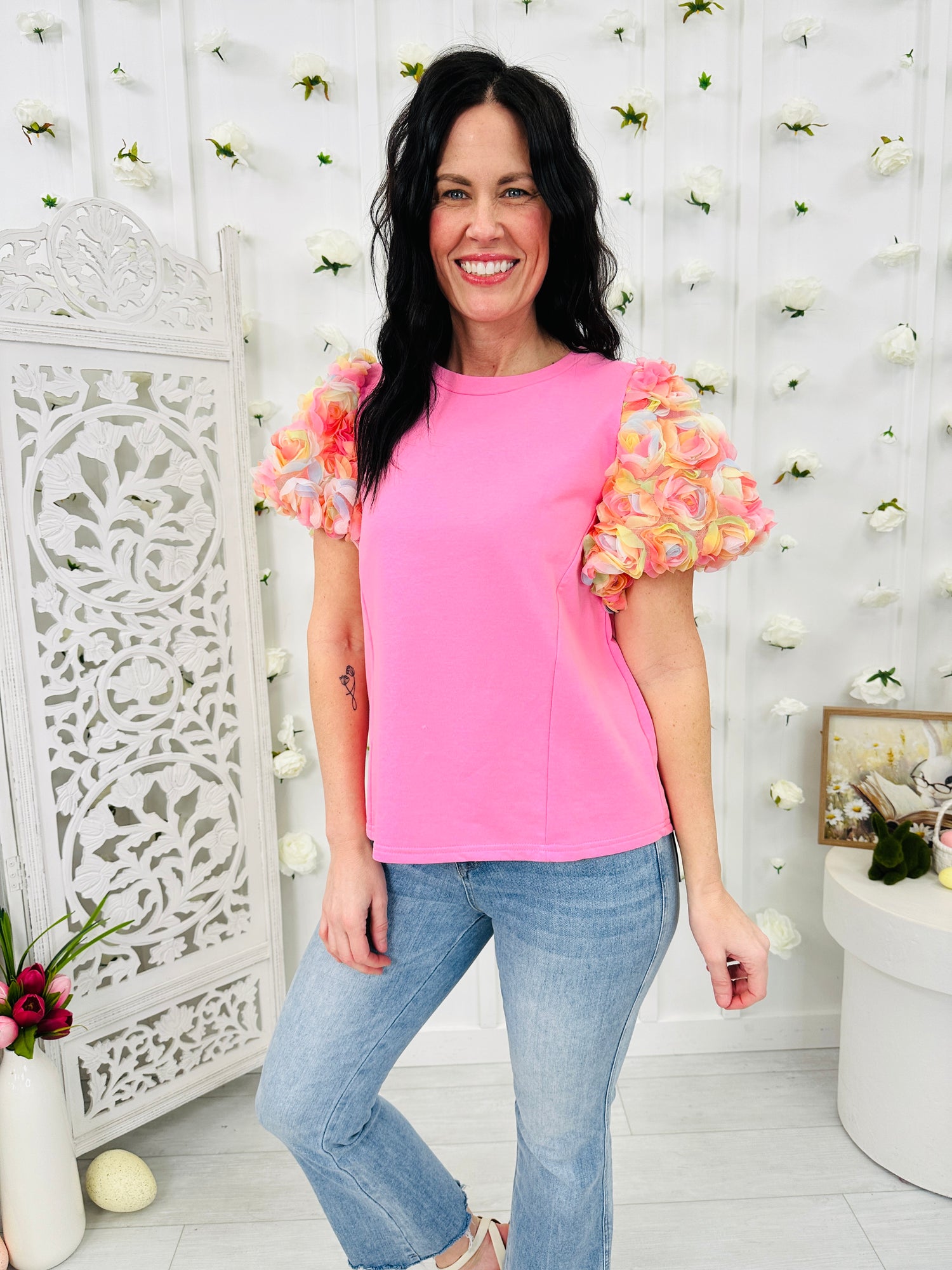 This top blends everyday comfort with a standout feminine detail. The soft stretchy knit body creates an easy, flattering fit while the classic round neckline keeps the look simple and versatile. The real statement comes from the floral organza sleeves, designed with layered sheer fabric that forms soft dimensional flowers for a bold, eye-catching touch. With its flattering fit and playful sleeve detail, this top pairs effortlessly with jeans or dyed denim when you want something comfortable yet fun.