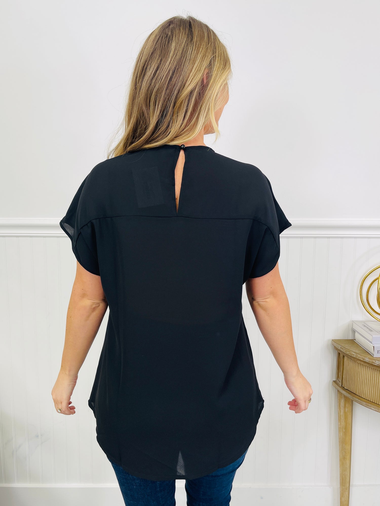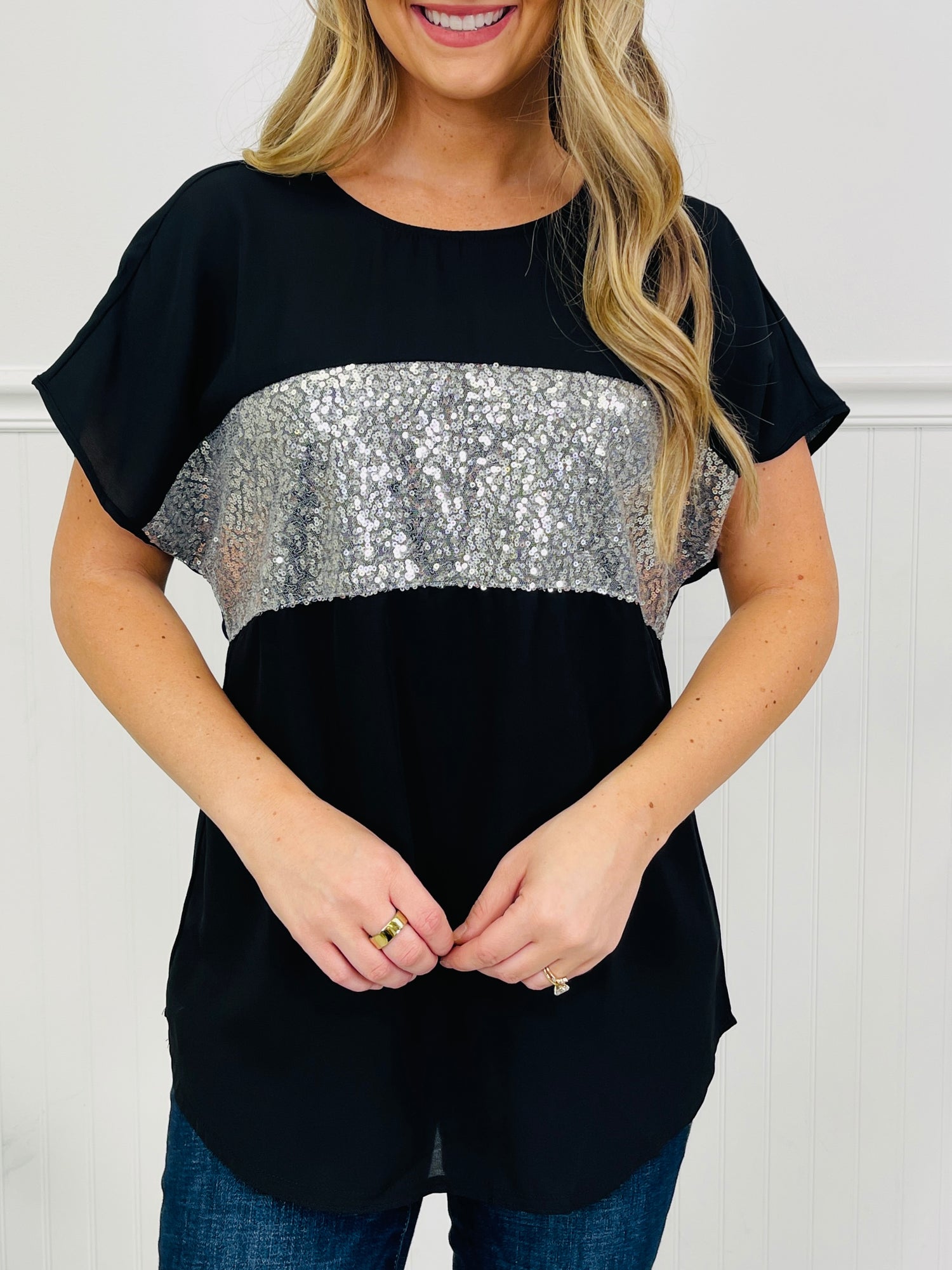 This top brings all the sparkle without any extra effort — the wide sequin panel across the front delivers instant shine, while the flowy black body keeps things comfortable and easy to wear. The relaxed silhouette drapes beautifully and moves with you, making it perfect for nights out, holiday parties, or anytime you want to feel a little extra. Pair it with denim or dress it up with sleek bottoms… either way, you’re going to feel amazing in this one.