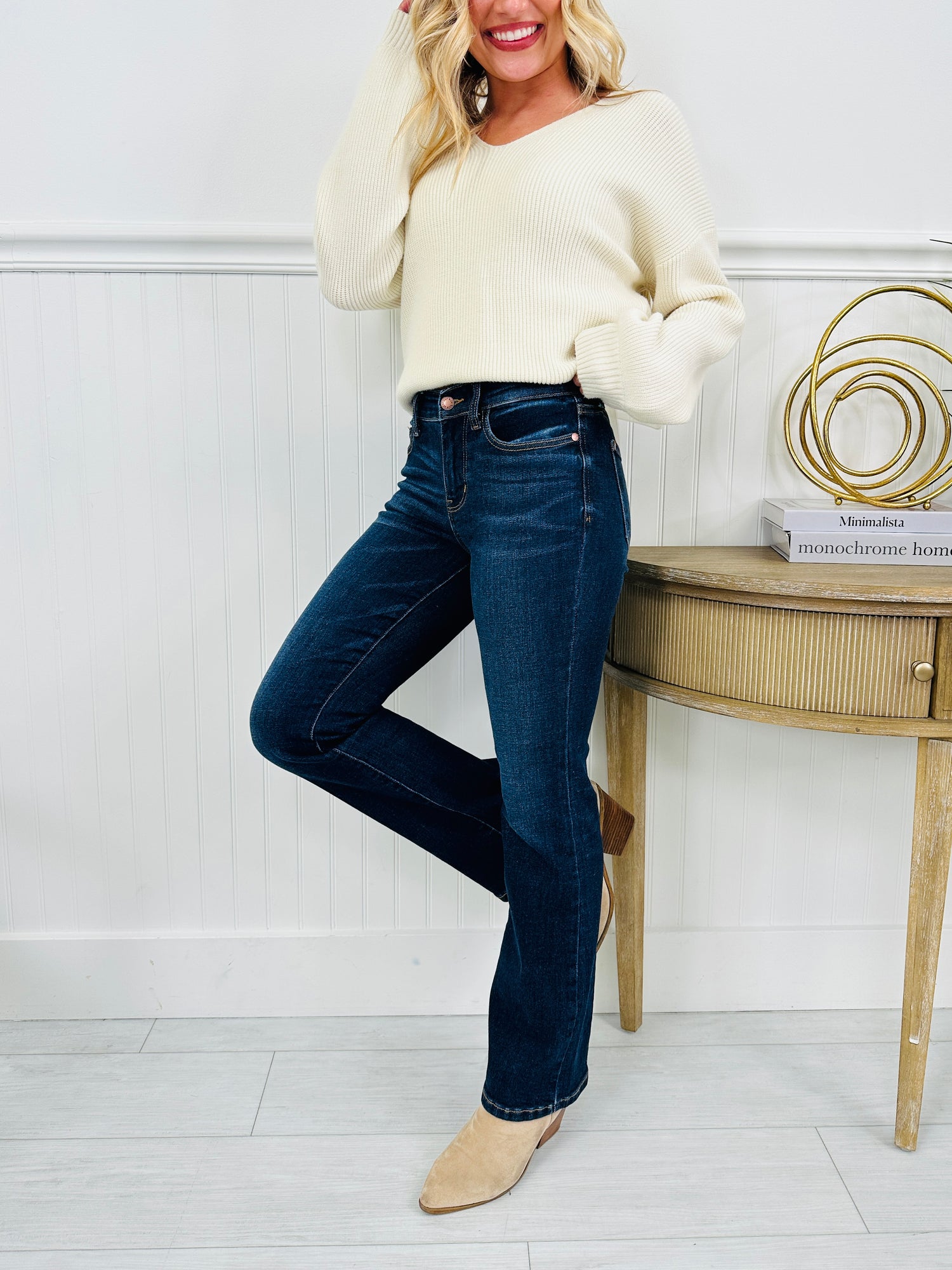 These dark and dreamy bootcut jeans will be a staple in your wardrobe this season. They are buttery soft, stretchy, and so comfortable. The wash is slimming and the bootcut silhouette will elongate your legs making you feel long, lean, and confident!