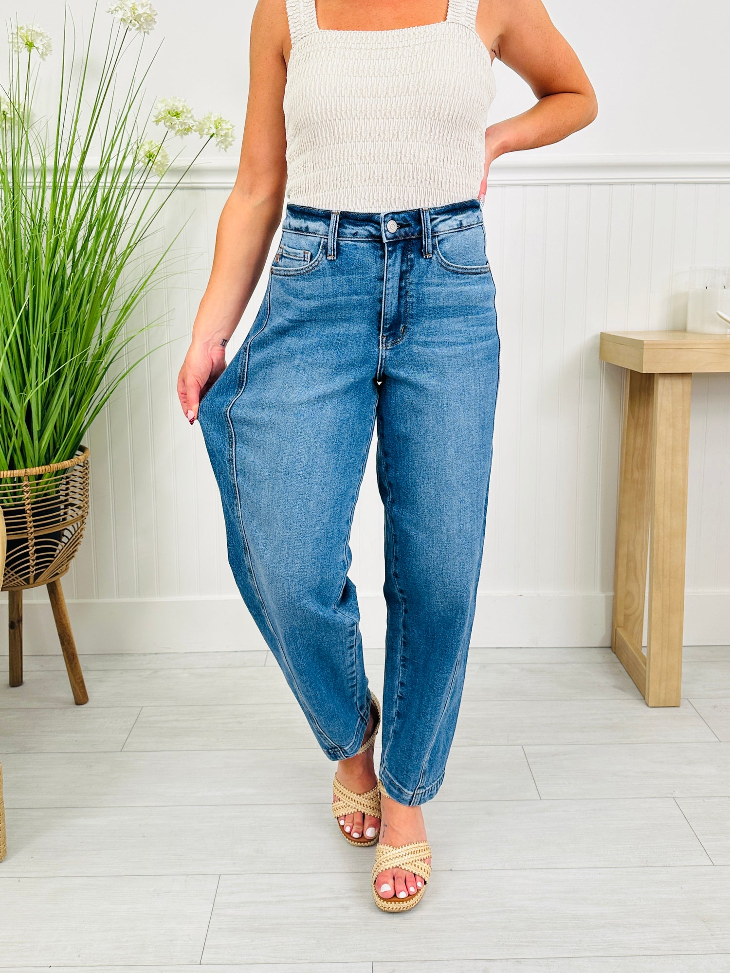These new jeans are going to give you the on trend and fresh curve style your wardrobe needs this season. They are the perfect blend of structure, comfort, and trend-forward style. These Judy Blue barrel style jeans feature a high-rise fit with a rigid front for a clean, flattering look and a stretchy back that moves with you for all-day comfort. It’s the best of both worlds—polished where you want it, flexible where you need it.
