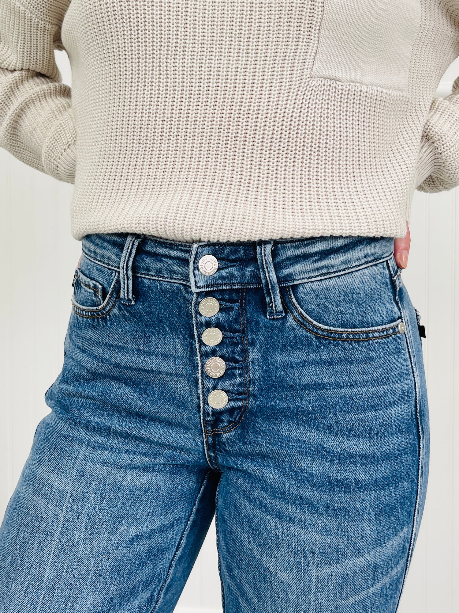 Timeless and versatile, these jeans bring together classic details and modern comfort. The button fly gives them a stylish twist, while the slim straight fit keeps the look sleek yet easy to wear. Plus, these jeans deliver the perfect mix of structure and flexibility with their signature Rigid Magic fabrication—smoothing in the front and stretchy in the back for all-day comfort.Made from a soft, medium wash denim with an extra comfortable stretch, they’re perfect for pairing with any top for an effortlessly polished outfit.