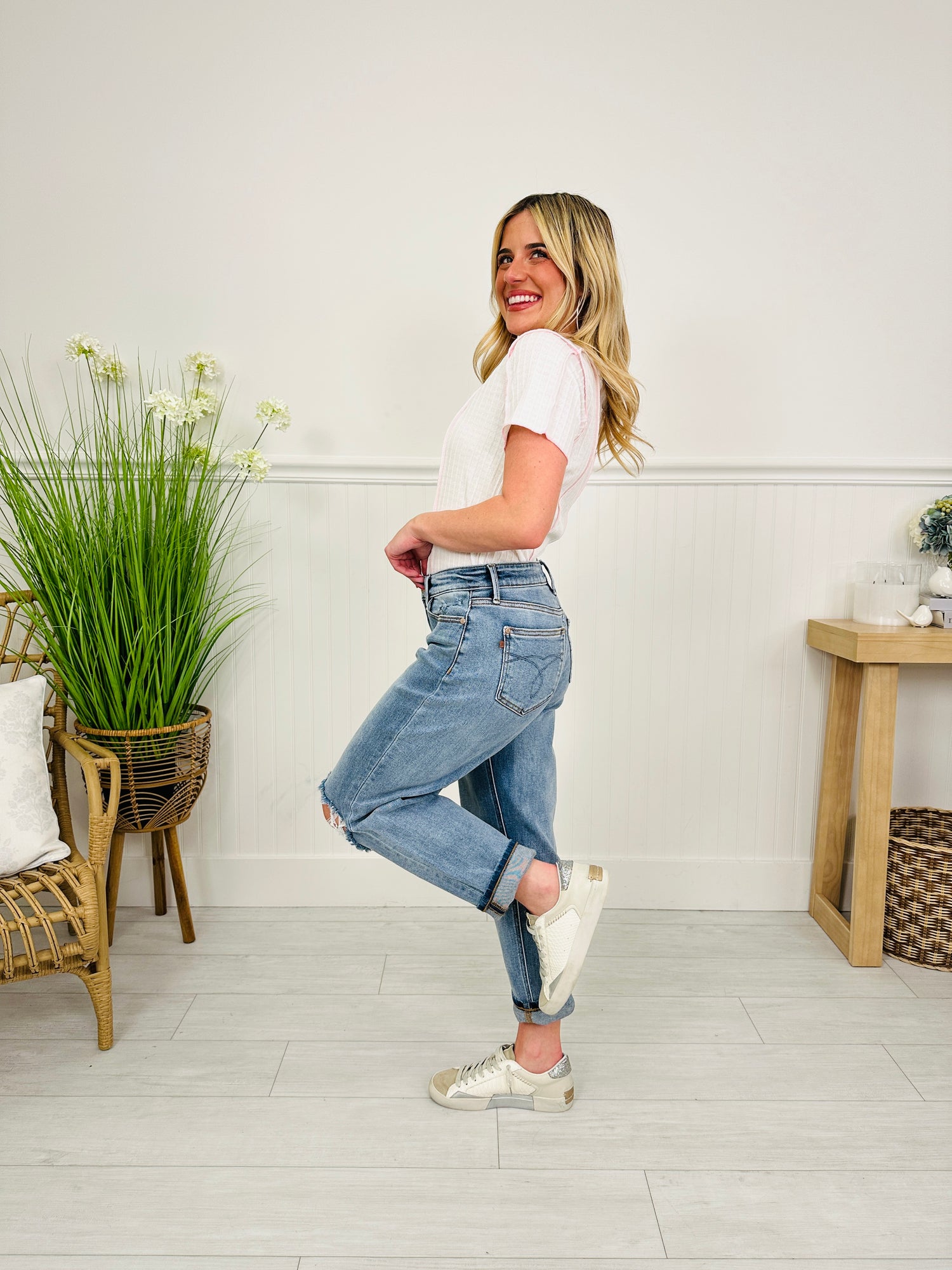 Designed with a flexible cuff, these jeans can be worn cuffed or uncuffed depending on your vibe or inseam, making them incredibly versatile for everyday wear. Pair them with sneakers or sandals and a graphic tee for a casual look, or dress them up with a wedges and a spring sweater. Easy, comfortable, and perfectly broken-in — these are the jeans you’ll reach for again and again.